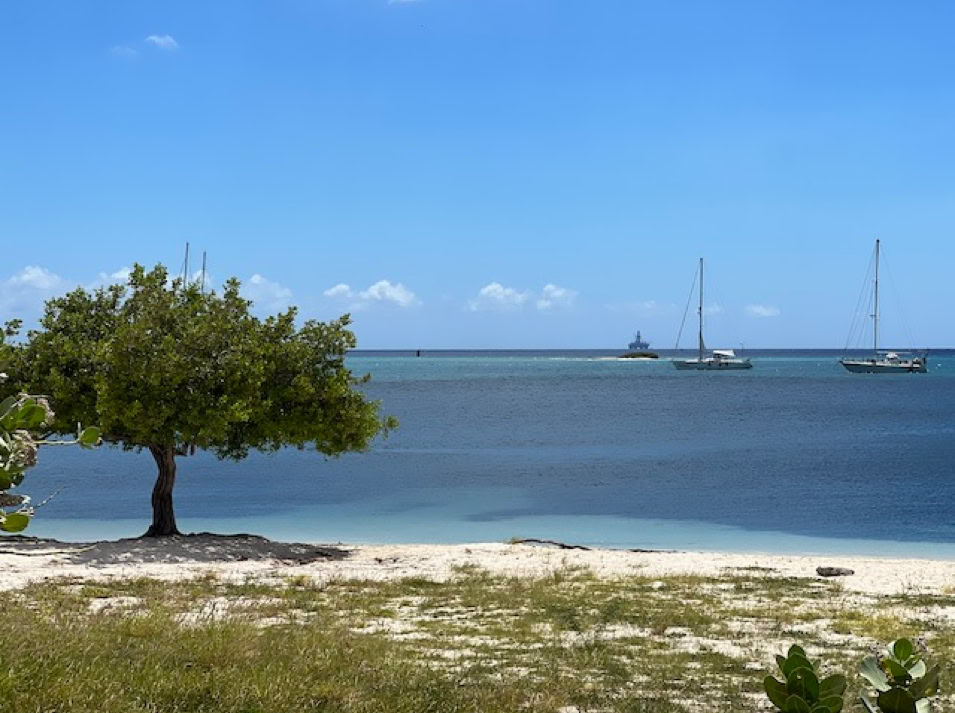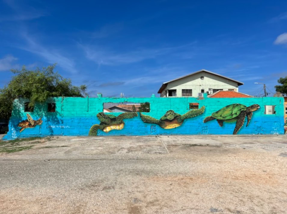 Wir fahren durch das markierte Fahrwasser in die Lagune vor Oranjestad. Auf dem Weg winken uns mal wieder die Crew der SY Paradise zur Begrüßung. Schön, so empfangen zu werden. Der Anker fällt in türkisblaues Wasser und die erste Schildkröte steckt ihren Kopf heraus. Natürlich gesellen wir uns schnell zu ihr, um ein erfrischendes Bad zu nehmen und gleichzeitig den Halt des Ankers zu kontrollieren.