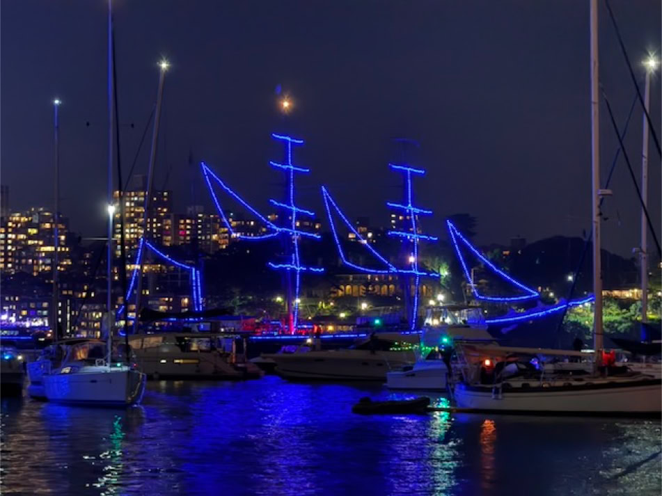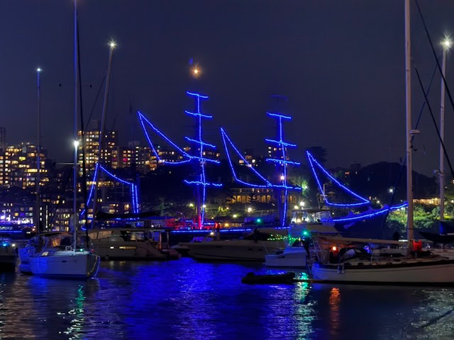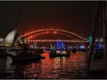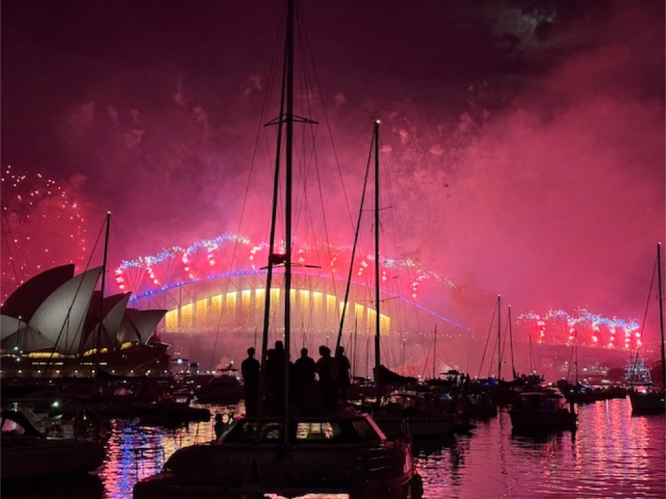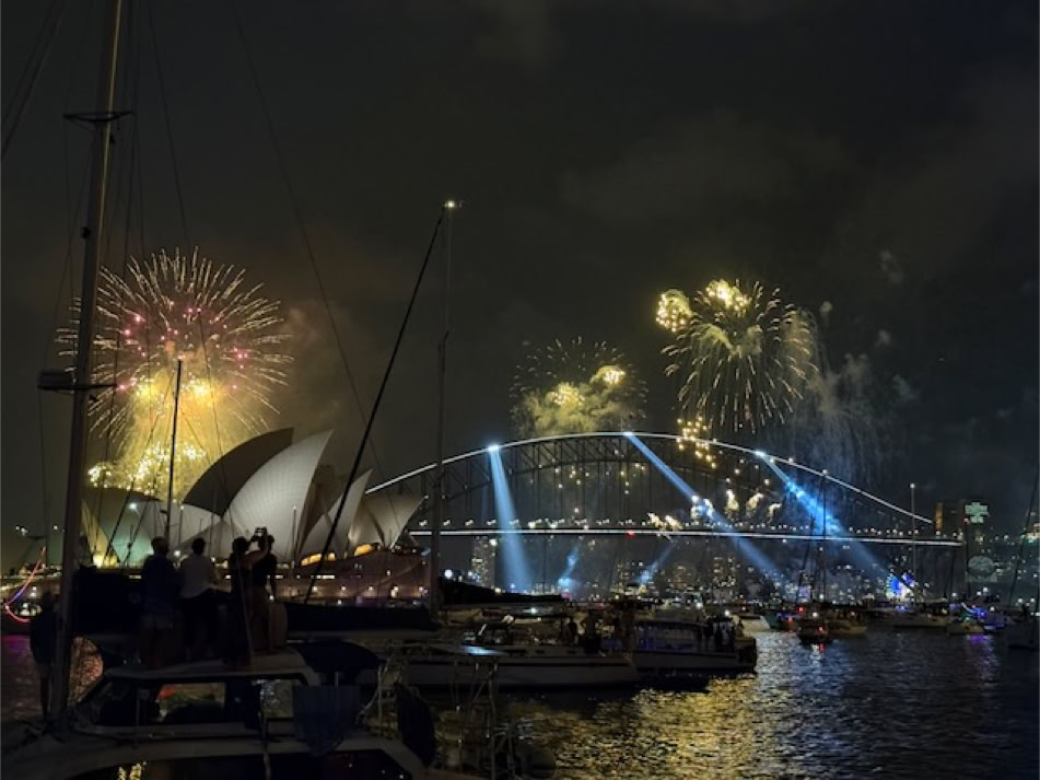 Bis es so weit ist, sammeln sich immer mehr Boote um uns herum. Doch für jedes neuankommende Boot findet sich noch eine Lücke. Am Ufer füllen sich bereits am Mittag die Zuschauer, die es sich gemütlich machen. Eine ganz besondere Stimmung liegt in der Luft. Die Vorfreude, das neue Jahr mit dem spektakulären Feuerwerk zu begrüßen, ist deutlich spürbar. Mit Einbruch der Dunkelheit beginnt bereits ein wunderschönes Lichterspiel rund um den Hafen. Die Harbour Bridge erstrahlt in verschiedenen Farben, auf den Segeln des Opernhauses leuchten Bilder, und ein Lichterkorso von Booten fährt langsam seine Runden. Um 21:00 Uhr erleuchten die ersten Raketen, das sogenannte Kinderfeuerwerk erhellt den Himmel und steigert die Erwartung.