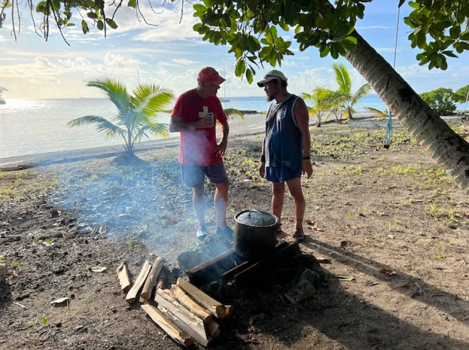 Segler verirren sich eher selten in dieses einsame und etwas abseits gelegene Atoll. Daher freuen sich die Ranger über neue Geschichten und kleine Geschenke wie Milchpulver, Kaffee, Bier und das ein oder andere Ersatzteil. Erfreut über die Abwechslung werden unsere drei Mannschaften zum BBQ am Strand eingeladen. Wir bringen Essen und Getränke an den Strand und werden dafür mit Kokosnusskrabben und Kokosnussmilch bewirtet. Ein wunderschönes, nachhaltiges Erlebnis für uns alle.