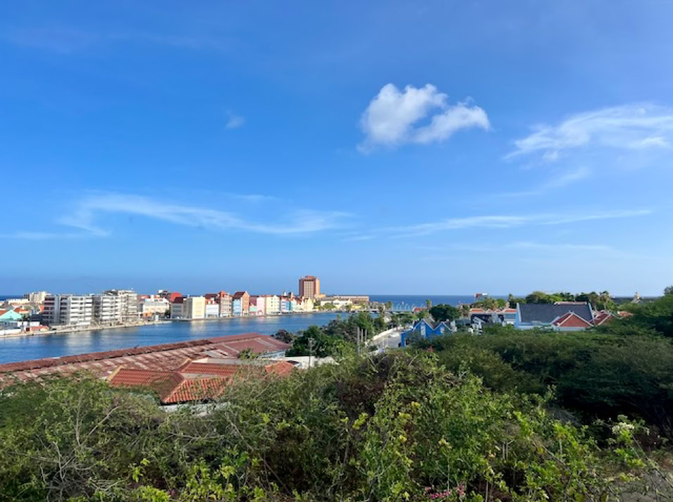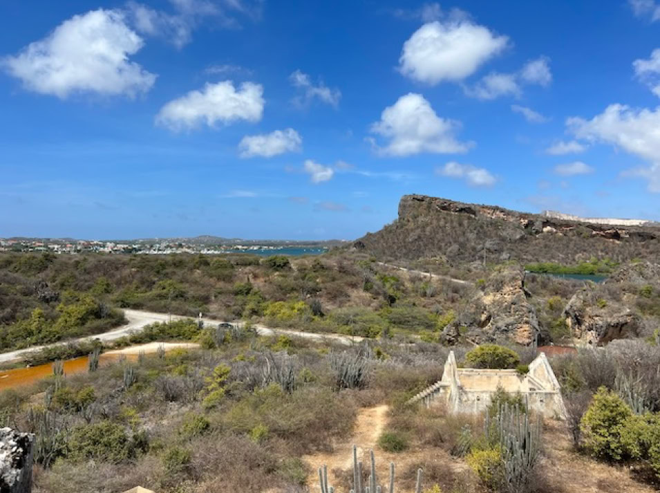 Unser Spaziergang führt uns zum Fort Beekenburg und wir genießen den herrlichen Ausblick auf die Bucht und den benachbarten Kabrietenberg.