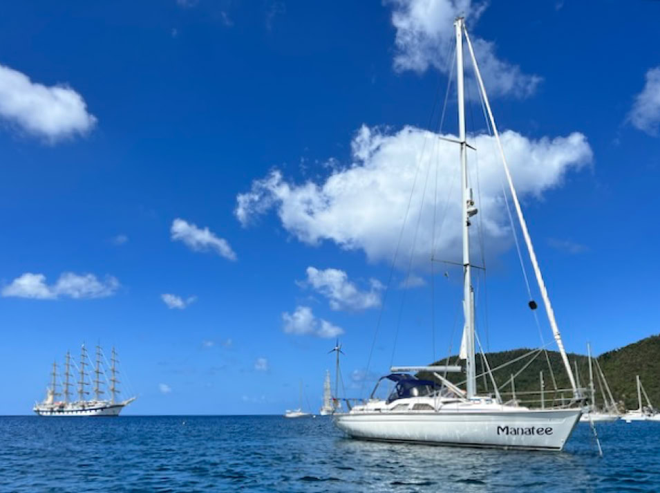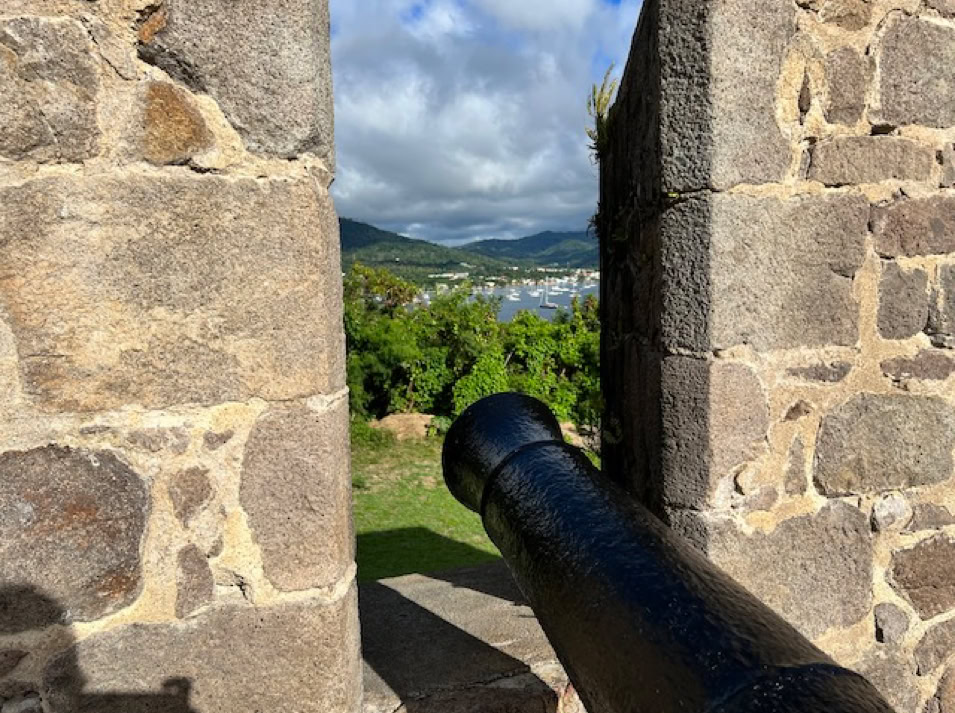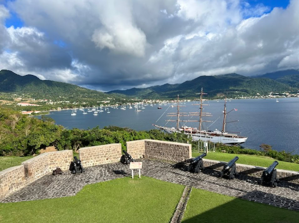 Es wird ruhiger. Während eines Spaziergangs zum Fort Shirley ändern wir mal die Perspektive und schauen zur Abwechslung in die Bucht und auf unsere Boote. Segelkreuzfahrtschiffe wie z. B. die Royal Clipper bereichern das Ankerfeld.