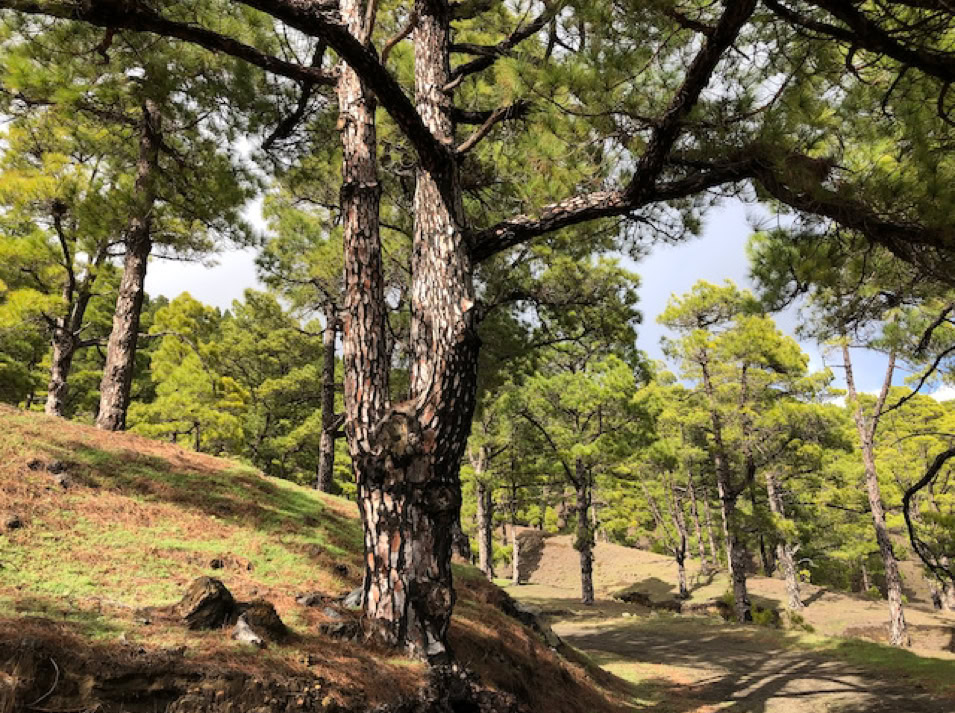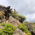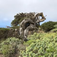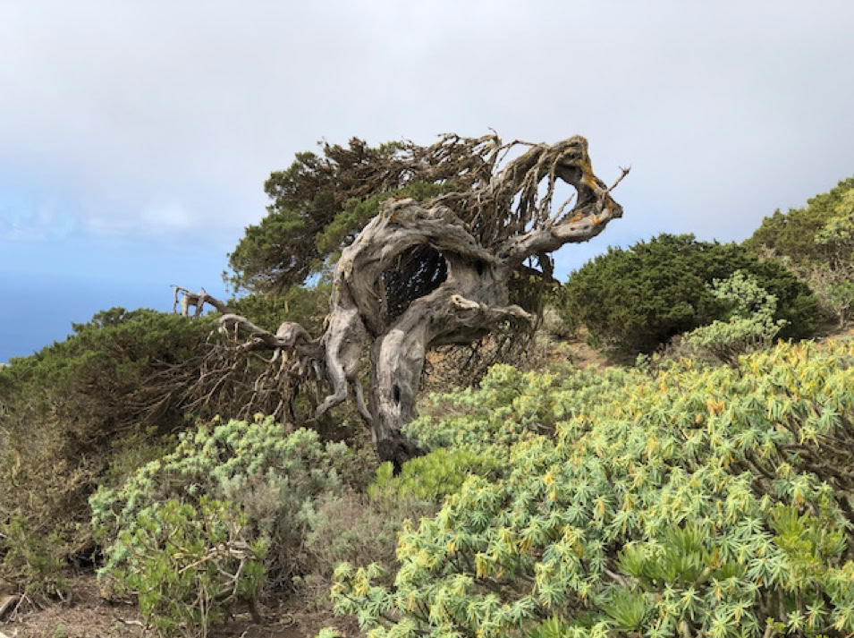 Auf den Weg zum westlichen Teil der El Hierros fahren wir durch grüne duftende Pinienwälder und machen Halt am Mirador de Bascos. Der Wind pfeift uns ordentlich um die Ohren. Die Aussicht ist fantastisch und die Paragleiter, welche über dem Tal schweben, kommen auf ihre Kosten. Gleich nebenan befindet sich das Gebiet von El Sabinar mit seinen Windflüchtern. Es ist schon erstaunlich wie die Wachholderbäume sich dem ständigen Wind angepasst haben und fantasievolle Objekte bilden.