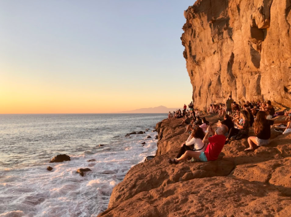 Am Sonnenuntergangsfelsen gleich um die Ecke, versammeln sich viele Urlauber, um wie der Name schon sagt, die Sonne im Meer untergehen zu sehen. Ein wunderschönes Erlebnis in entspannter Atmosphäre. Selbst hier können wir rüber nach Teneriffa auf die Spitze des Teides schauen.