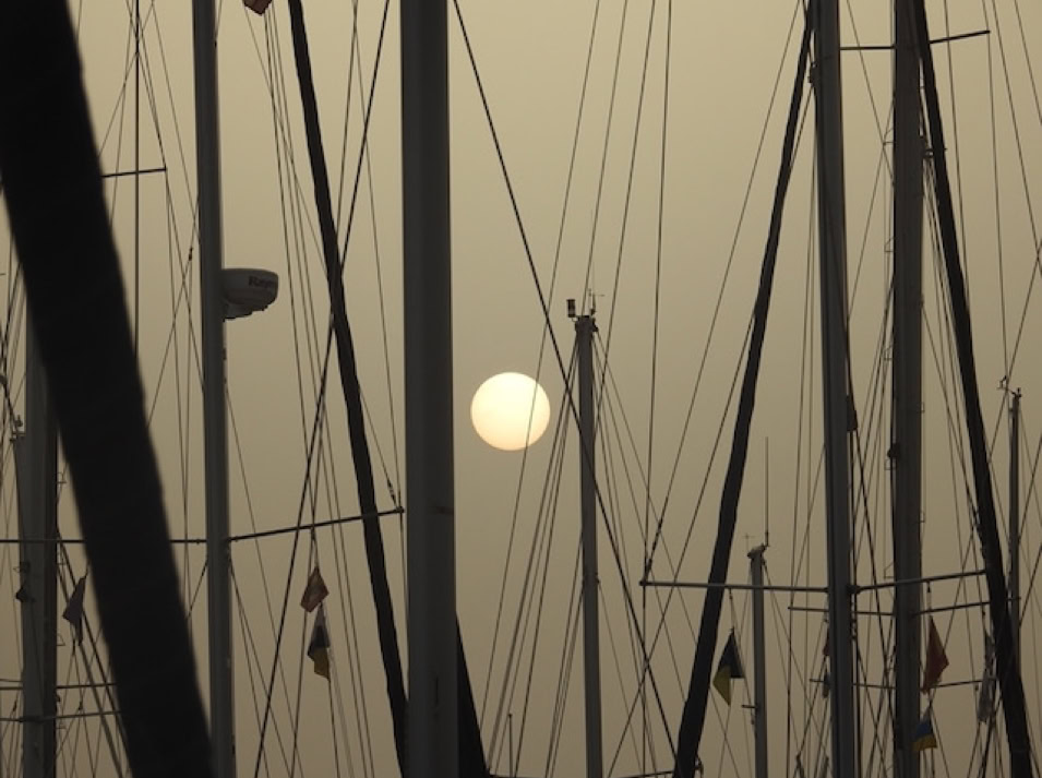 Der feine Sand reduziert nicht nur die Sichtweite wie bei Nebel, sondern ist unangenehm für Augen und Lunge. Der dabei stetigen Süd-Ost- bis Ostwind lässt ordentlich Schwell in den Hafen. Unseren Steg hat dieses Ereignis stark in Mitleidenschaft gezogen. Wir überlegen wer jetzt wen hält. Der Steg uns oder doch eher umgekehrt.