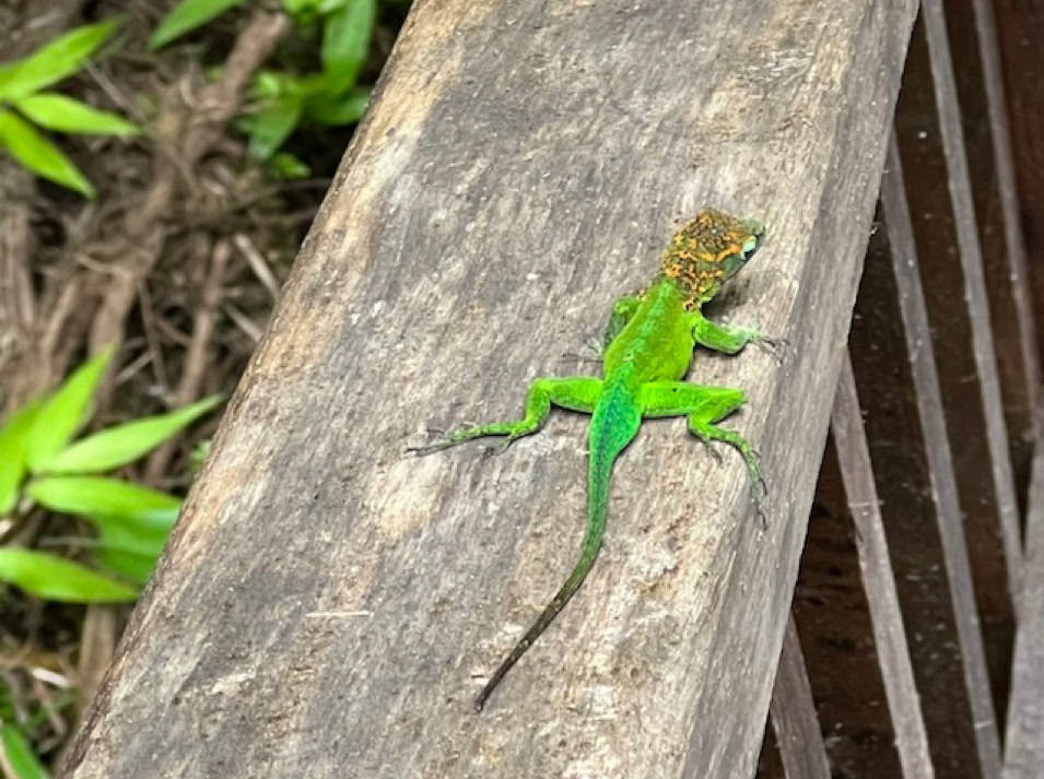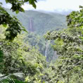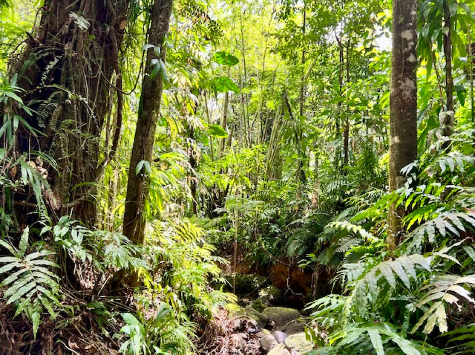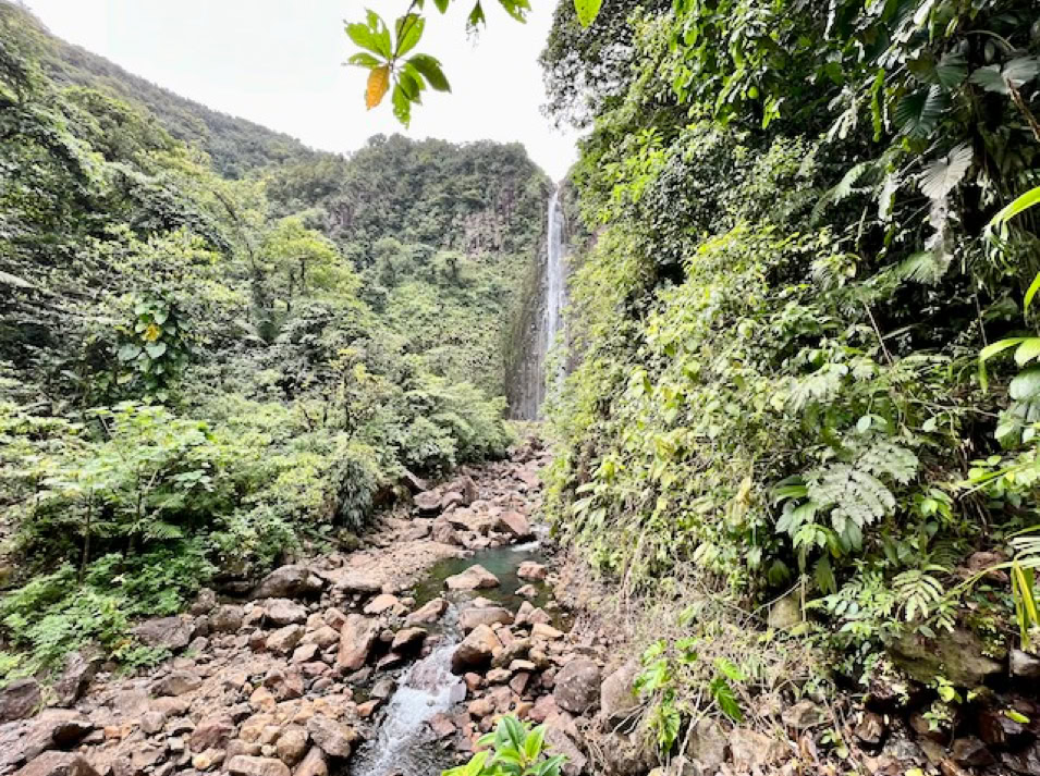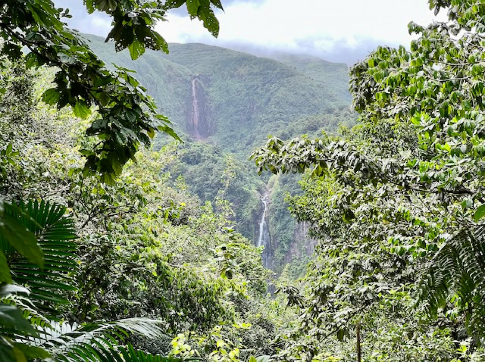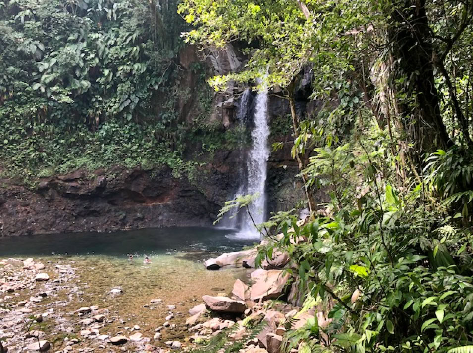 Das eigentliche Ziel, einen 110 Meter hohen Wasserfall erreichen wir an diesem Tag nicht. Unser Navi führt uns zu einem Parkplatz von dem es zwar zu den Drei Wasserfällen geht, aber eben andere Wege ausweist als geplant. So wandern wir ca. 1 1/2 Stunden durch die wundervolle Natur des Regenwaldes zum „Troisieme Chute du Carbet“ , dem Dritten Wasserfall und müssen am Schluss sogar noch klettern. Doch der Aufwand hat sich gelohnt. Die Sonne lässt das Wasser leuchten und ein wunderschöner Ort belohnt uns für den doch etwas längeren Weg.