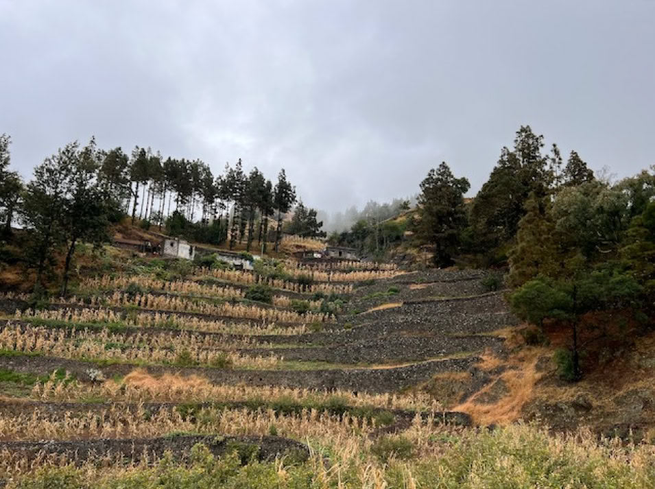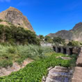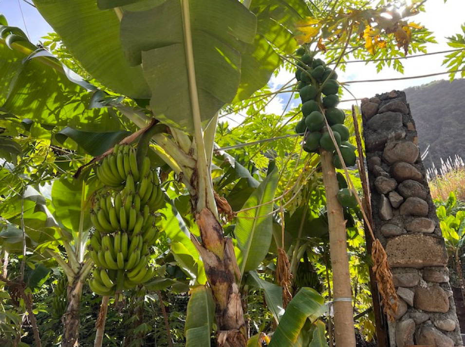 Wir sind begeistert. Trockene Wiesen und Felder mit Lavagestein wechseln zu üppig grünen Arealen. Das Wasser kommt aus den Bergen und versorgt grüne Wälder, Bananenplantagen, Papayas, Kartoffeln und Zuckerrohr.