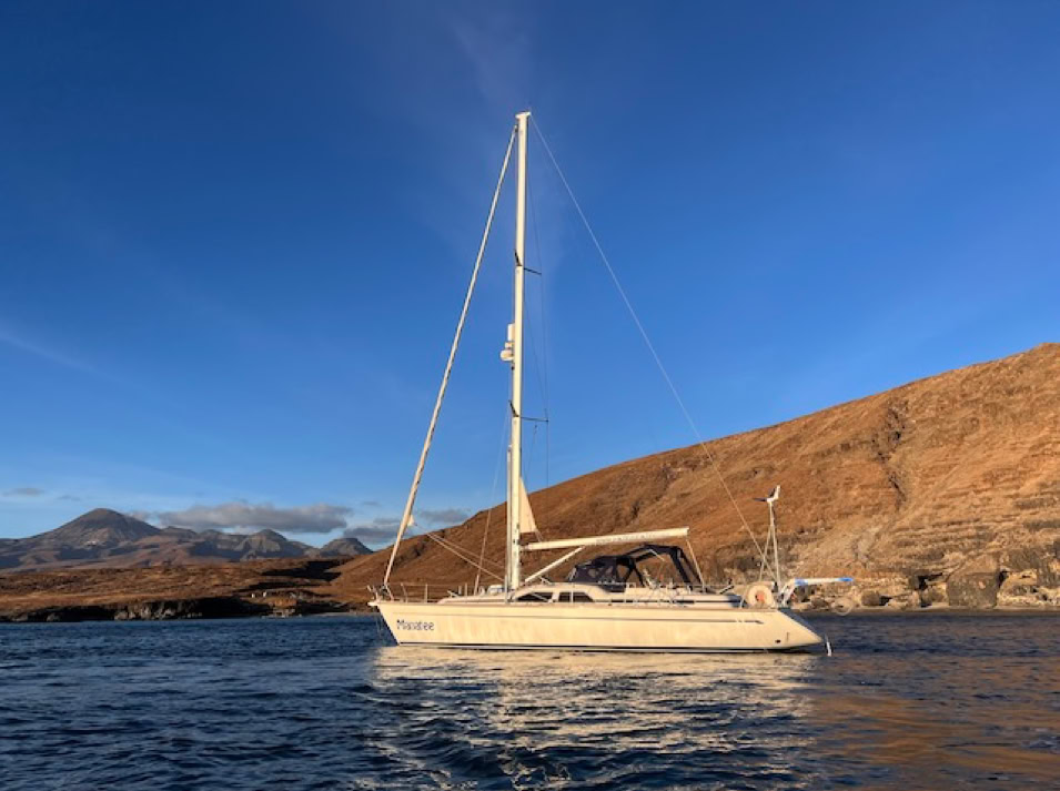 In der Abenddämmerung lassen wir in der Bucht vor Carrical den Anker fallen und den Tag Revue passieren.