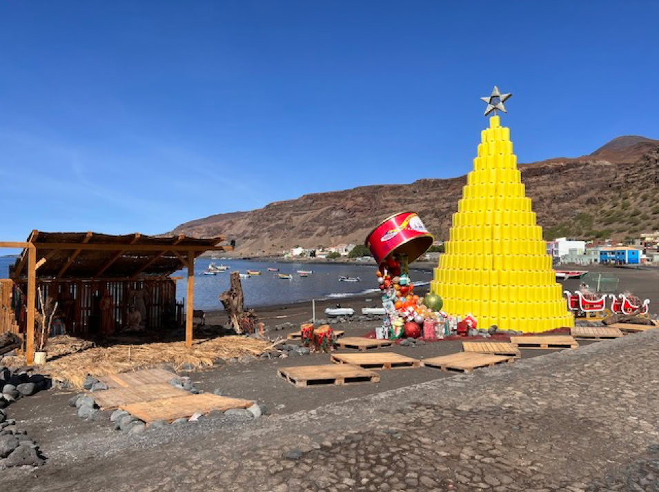 Hier heißt es erst einmal die Polizeistation zu finden und sich ordentlich anzumelden. Der Ort ist überschaubar und ganz hübsch. Uns gefällt der Weihnachtsbaum aus gelben Kanistern, der uns am Ufer entgegen leuchtet. Gleich daneben schüttet eine große Thunfischdose Geschenke aus.
