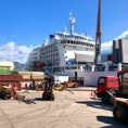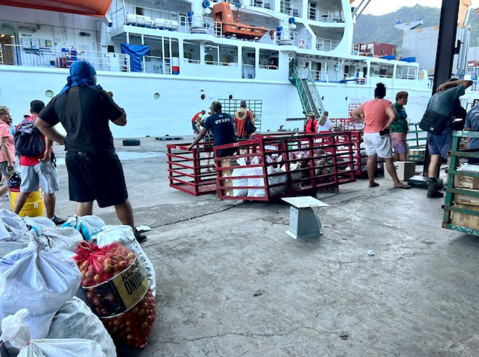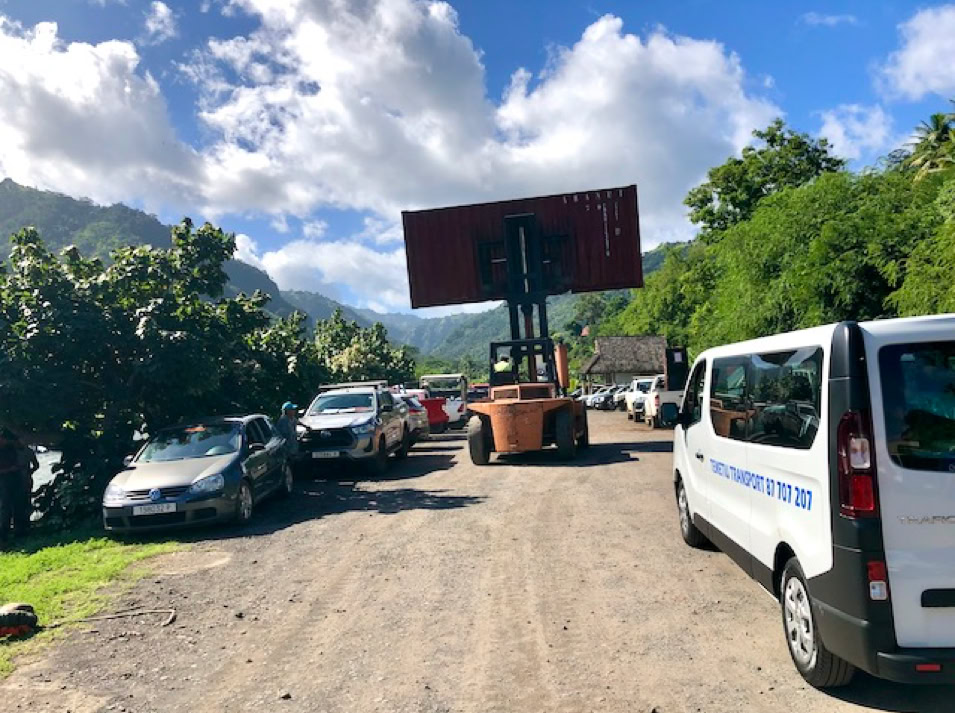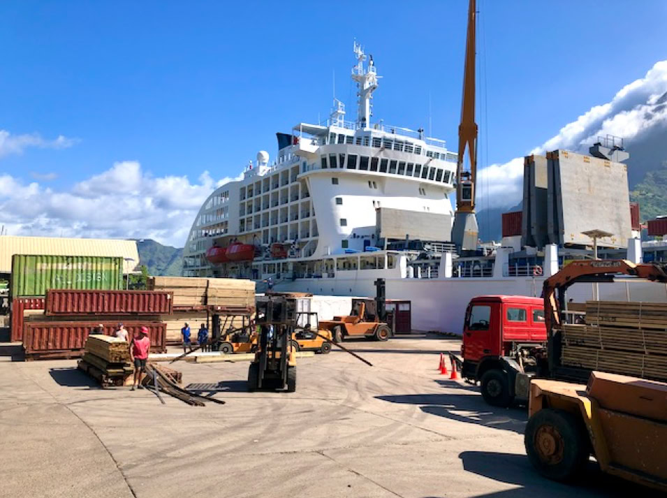Immer am Donnerstag kommt das Versorgungsschiff in die Bucht. Während unseres Aufenthaltes läuft die „Aranui V“ den Hafen an, welche je zur Hälfte Kreuzfahrt- und Versorgungsschiff für die Inseln ist. Super Kombination. Das Treiben an diesem Tag ist beeindruckend. Gefühlt die ganze Insel findet sich im Hafengebiet ein. Es wird Be- und Entladen. Gabelstapler transportieren Container quer über den Platz. Es herrscht ein munteres Treiben in der ansonsten so ruhigen Gegend.