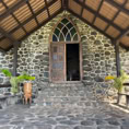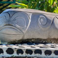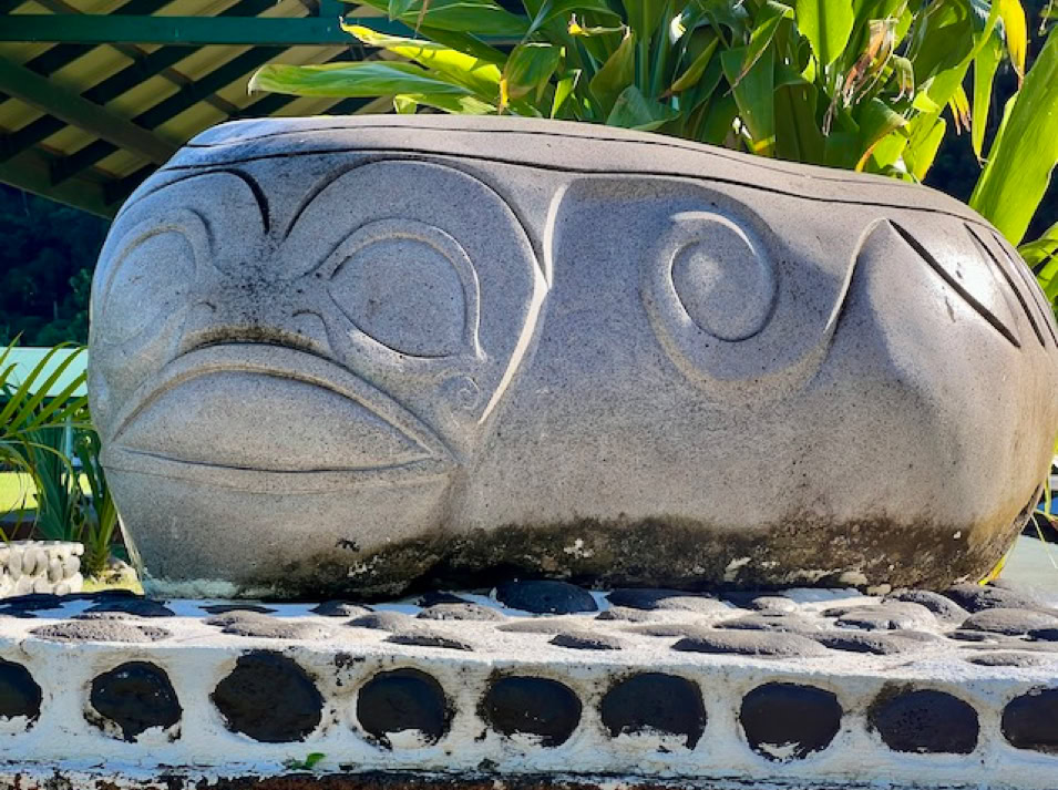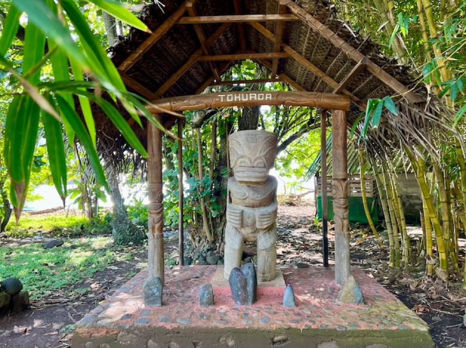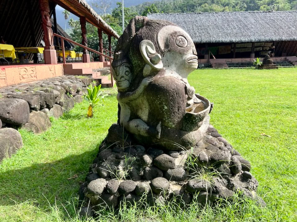 Atuoa ist sozusagen die Hauptstadt von Hiva Oa und sieht aus wie ein großes schönes Dorf. Hübsche Häuser stehen umsäumt von Gärten am Straßenrand. Überall leuchten Blüten und Pampelmusenbäume stehen in den Gärten. Ein großer Festplatz befindet sich im Zentrum des Ortes. Und überall finden wir die sogenannten Tikis. Figuren mit großen Köpfen und mythologischen Hintergrund. Was diese hier alle bedeuten, wissen wir nicht. Doch sie werden verehrt und auch als schöne Holzschnitzereien angeboten.