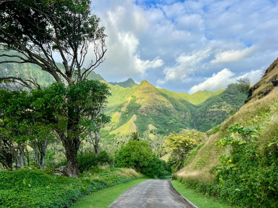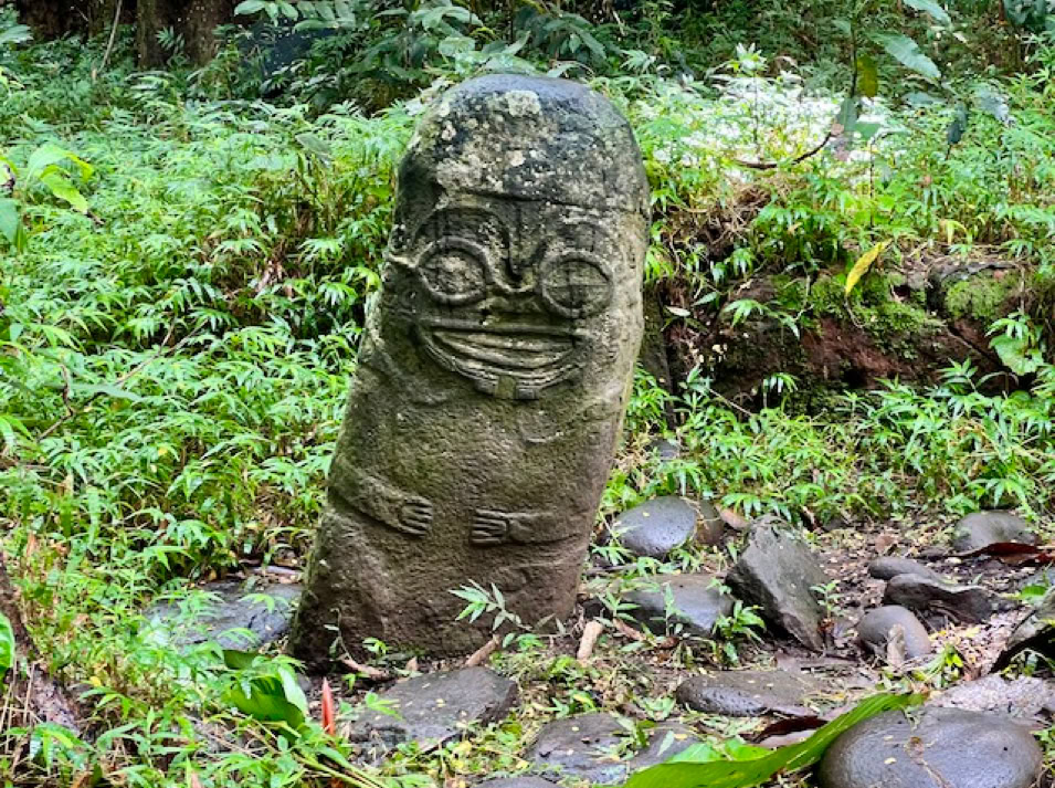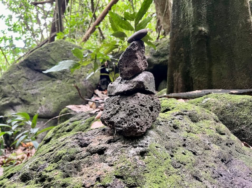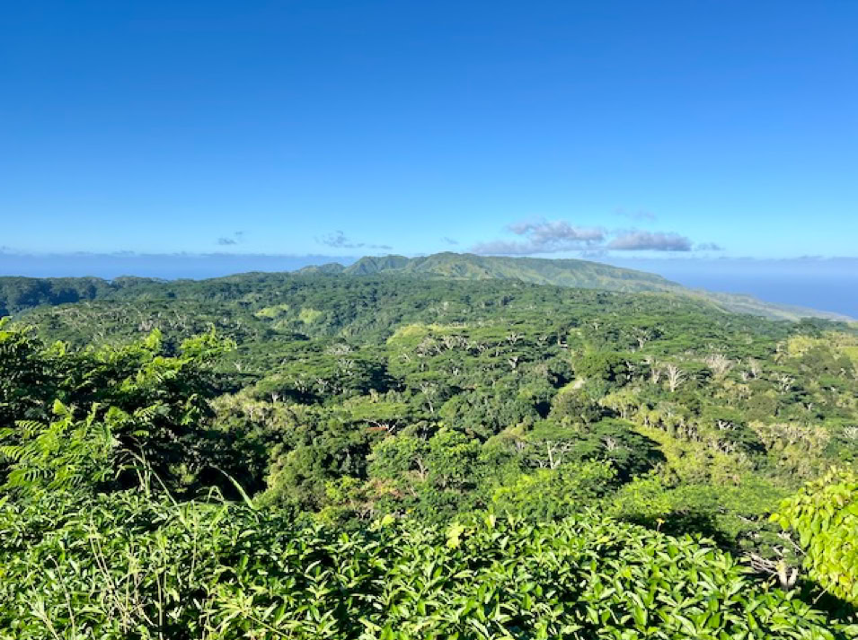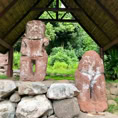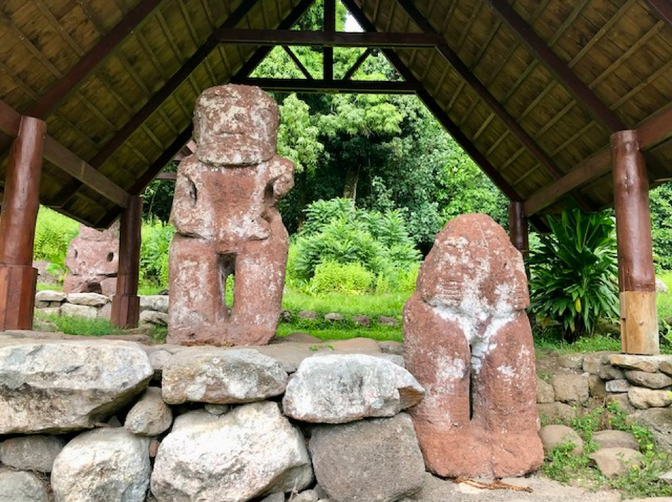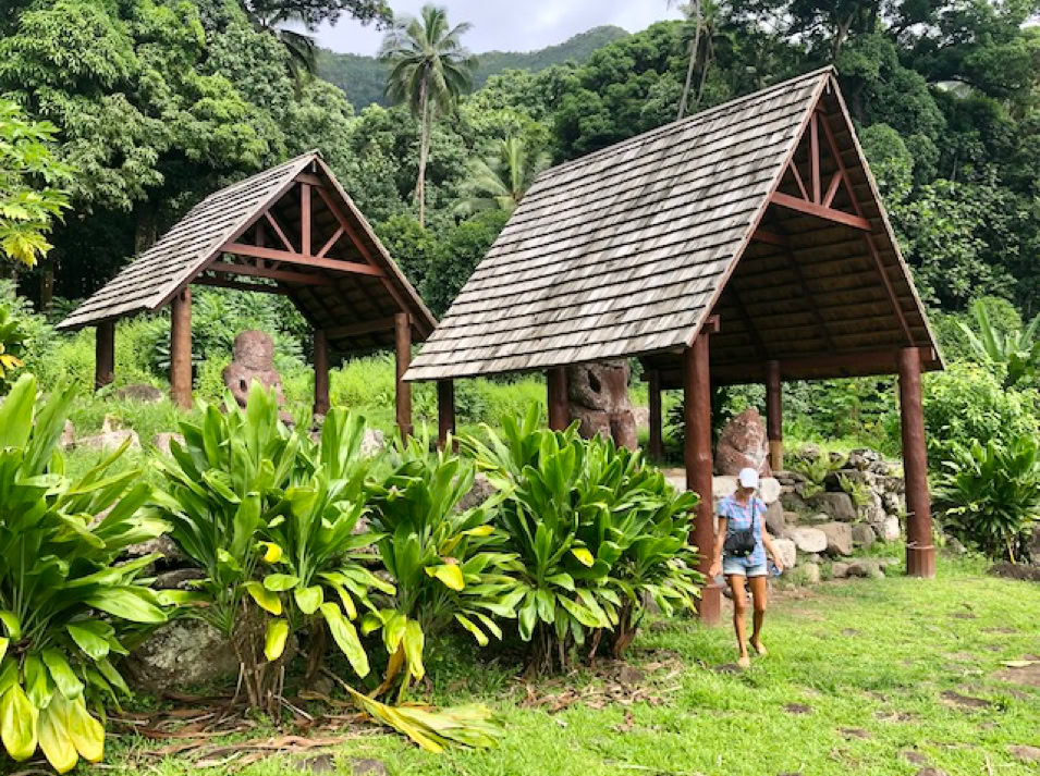 Mit einem Mietauto erkunden wir Hiva Oa. Verfahren kann man sich nicht. Es gibt nur eine Straße quer über die Insel. Dafür geht es aber steil bergauf und bergab. Unterwegs stehen mal Pferde, Kühe oder auch Ziegen am Straßenrand. Wir halten immer wieder an und genießen die wunderschöne Aussicht. Es geht zum lächelnden Tiki, welcher versteckt mitten im Wald steht und uns sehr gut gefällt, aber auch zum großen alten Tiki im kleinen Freilichtmuseum am Ende der Straße.