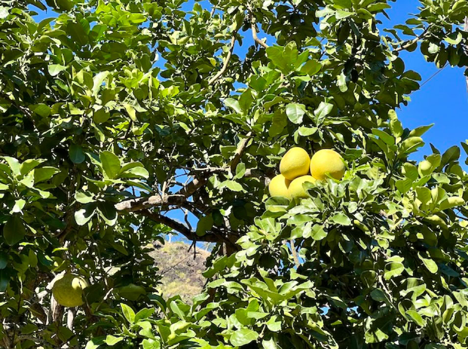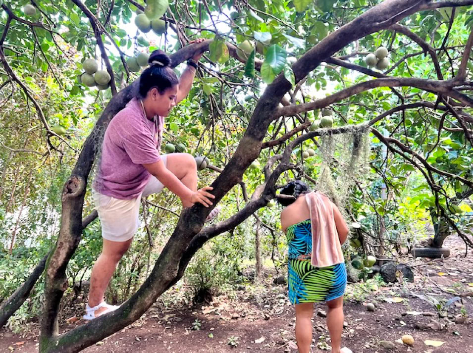 Im kleinen charmanten Dorf Hanavave treffen wir auf sehr freundliche Menschen und bekommen direkt Obst aus ihrem Garten.