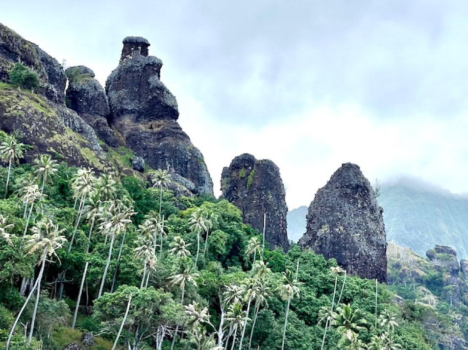 Die Ankunft in Fatu Hiva ist ein Traum. Beeindruckende Berge ragen hoch aus dem Ozean und die Felsformationen in der Ankerbucht regen unentwegt die Fantasie an. Sehen sie doch in jedem Tageslicht anders aus. Wir hören das Gemecker von Ziegen und entdecken diese zwischen den Felsen. Wahre Kletterkünstler!