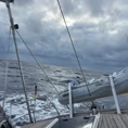 Auf den letzten Meilen funktioniert die Rollanlage unseres Großsegels nicht mehr. Eine Latte ist gebrochen und unser Segel klemmt fest. Nach vielen Versuchen es doch noch zu befreien, fixieren wir es schließlich am Baum und an der Reling und segeln nur mit Genua weiter. Ärgerlich! Doch es funktioniert und wir kommen weiter gut voran.
