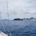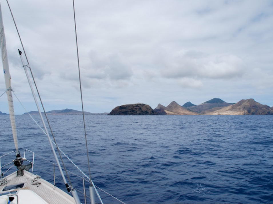 Land in Sicht! Vor uns liegen die Berge von Porto Santo und anstatt der Wind uns weiter zur Insel schiebt, schläft er einfach ein. So muss der Motor wieder ran.