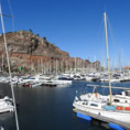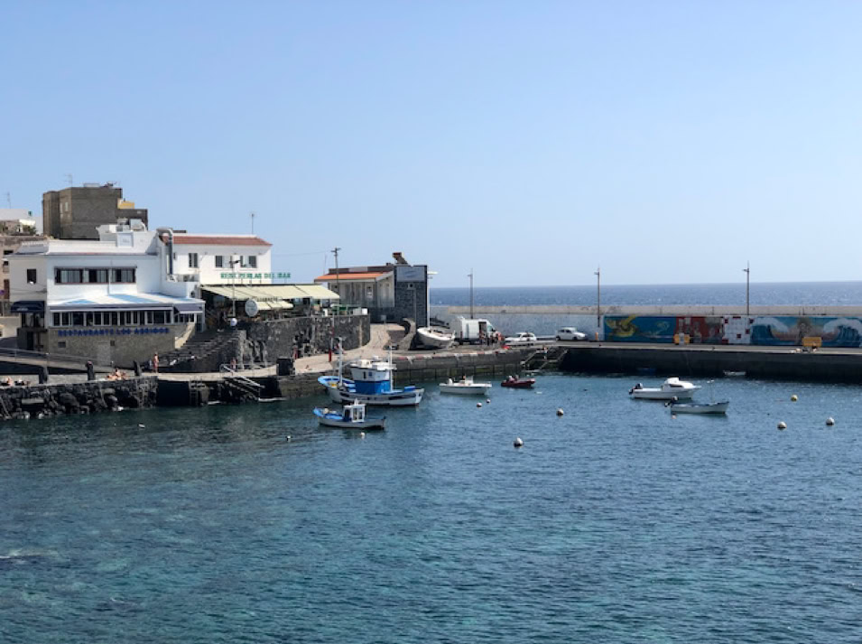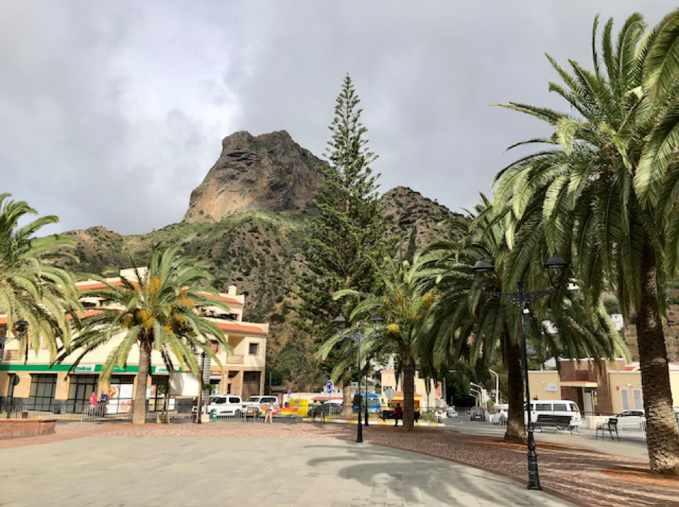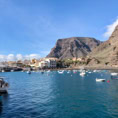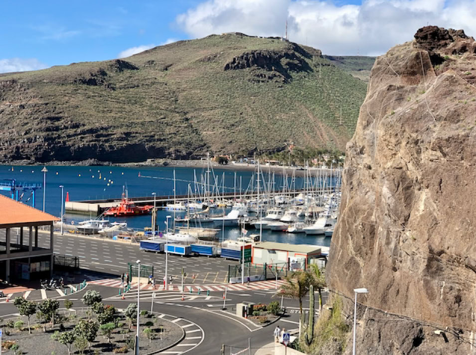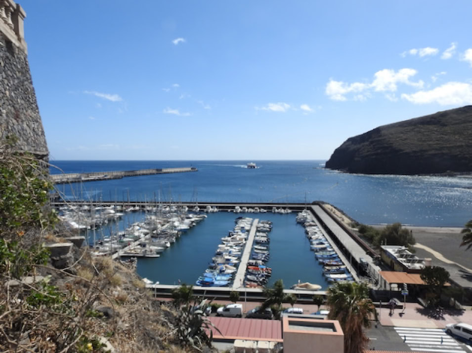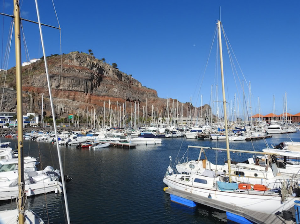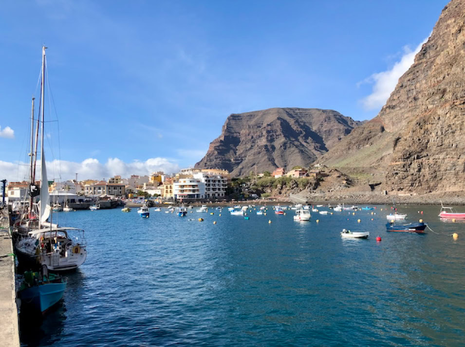 La Gomera, die zweitkleinste Insel der Kanaren hat wieder ein anderes Gesicht als ihre Schwestern. Neben dem Hafen erhebt sich ein rotbrauner Fels und bildet den ruhigen Hintergrund zu den vielen sanft schaukelnden Booten.