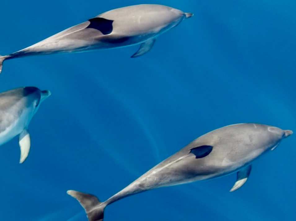 Irgendwann muss der Motor dann doch etwas unterstützen, um nicht auf der Stelle zu schaukeln. Schon bald begleiten uns nacheinander zwei Delfinschulen, welche sich emsig im Wasser tummeln und in der Bugwelle schwimmen. Zur Krönung kommen uns parallel noch Pilotwale entgegen und ziehen an uns vorbei. Wow! Was für ein Erlebnis!