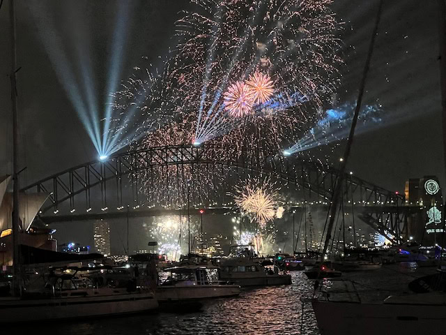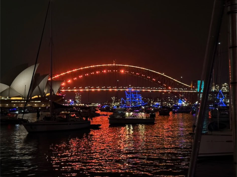 Bis es so weit ist, sammeln sich immer mehr Boote um uns herum. Doch für jedes neuankommende Boot findet sich noch eine Lücke. Am Ufer füllen sich bereits am Mittag die Zuschauer, die es sich gemütlich machen. Eine ganz besondere Stimmung liegt in der Luft. Die Vorfreude, das neue Jahr mit dem spektakulären Feuerwerk zu begrüßen, ist deutlich spürbar. Mit Einbruch der Dunkelheit beginnt bereits ein wunderschönes Lichterspiel rund um den Hafen. Die Harbour Bridge erstrahlt in verschiedenen Farben, auf den Segeln des Opernhauses leuchten Bilder, und ein Lichterkorso von Booten fährt langsam seine Runden. Um 21:00 Uhr erleuchten die ersten Raketen, das sogenannte Kinderfeuerwerk erhellt den Himmel und steigert die Erwartung.