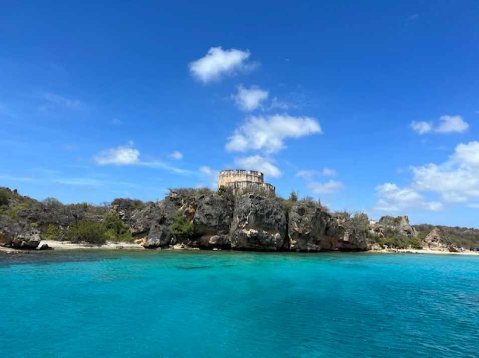 Unser Spaziergang führt uns zum Fort Beekenburg und wir genießen den herrlichen Ausblick auf die Bucht und den benachbarten Kabrietenberg.