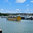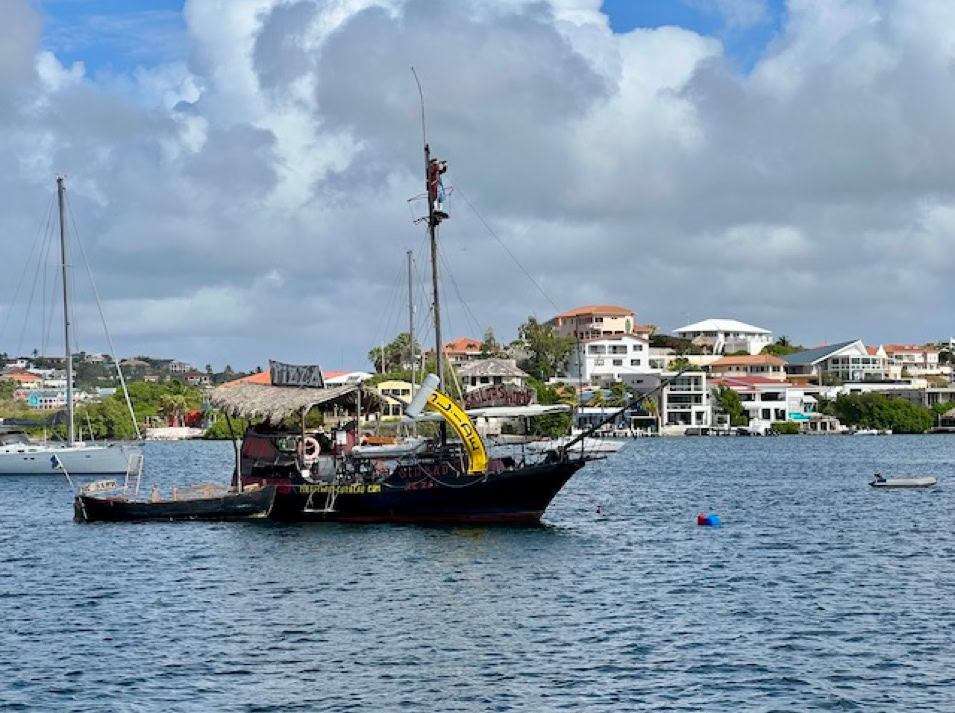 In unserem Ankerfeld lässt der Pirat am Mast des Pizzabootes seinen Blick über die Boote schweifen und es sieht schon merkwürdig aus wenn hier auf dem Wasser ein Bus vorbeifährt.