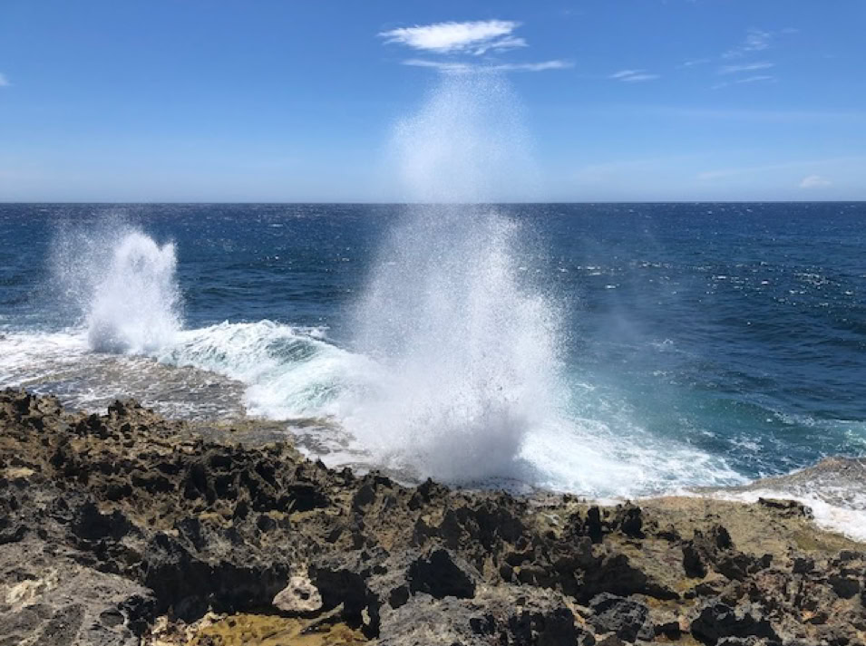 Der Norden der Insel ist rauh und faszinierend. Nach einer sehr holprigen Fahrt über Sandwege, laufen wir über Riffgestein und beobachten wie die Gischt des Atlantiks auf das Ufer trifft.