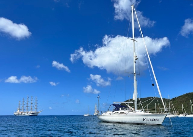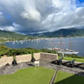Es wird ruhiger. Während eines Spaziergangs zum Fort Shirley ändern wir mal die Perspektive und schauen zur Abwechslung in die Bucht und auf unsere Boote. Segelkreuzfahrtschiffe wie z. B. die Royal Clipper bereichern das Ankerfeld.