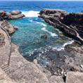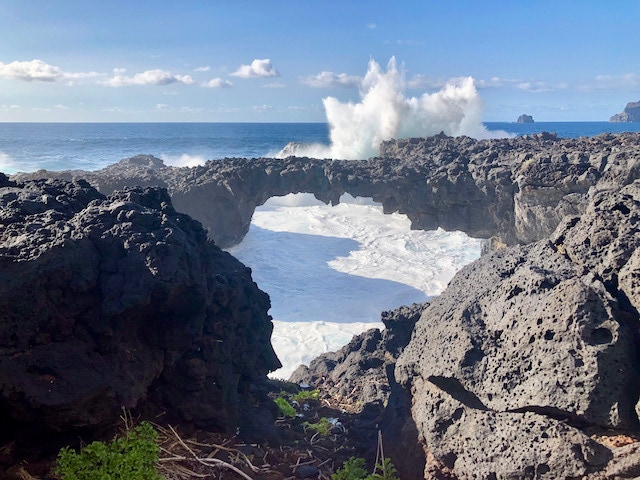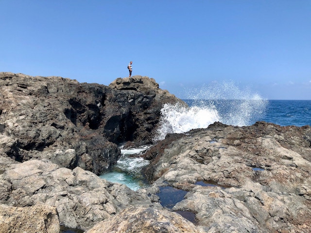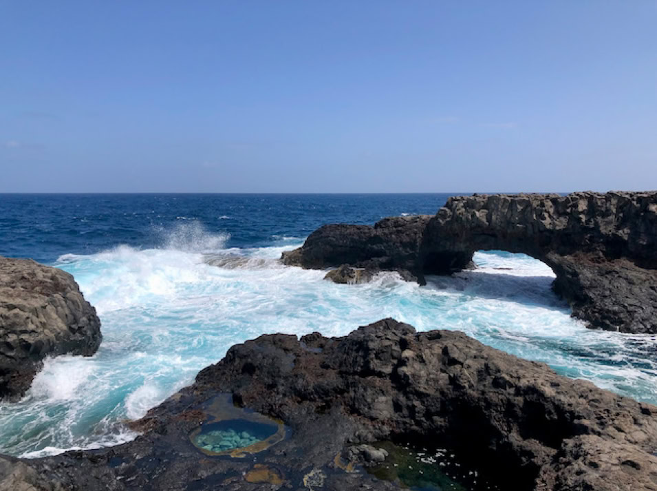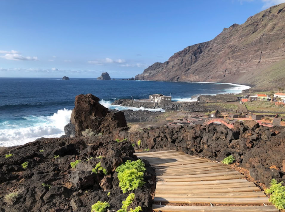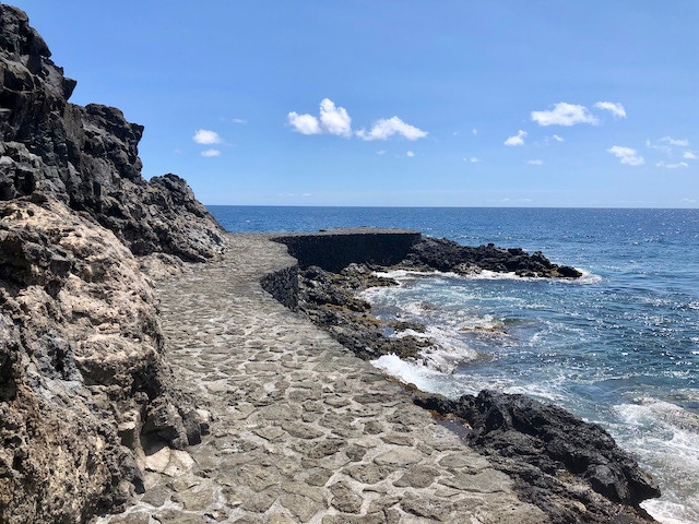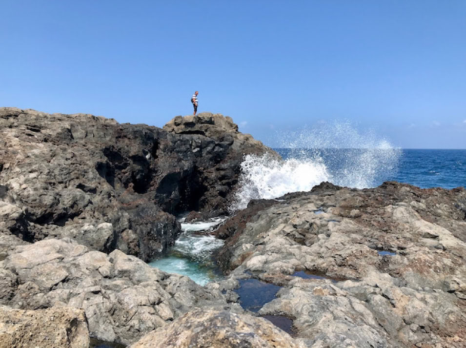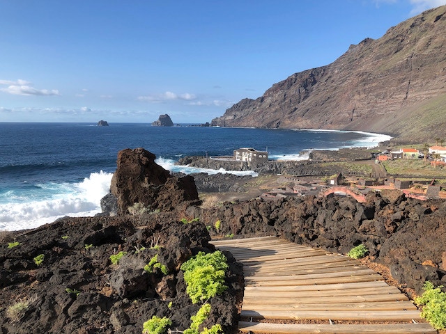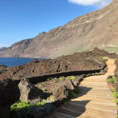 Der Küstenweg von Las Puntas lädt uns zum Spaziergang ein und so laufen wir über den mit Bohlen ausgelegten Weg durch die vulkangeprägte Landschaft, lauschen der Brandung und bewundern die Felsformationen am Ufer.