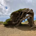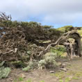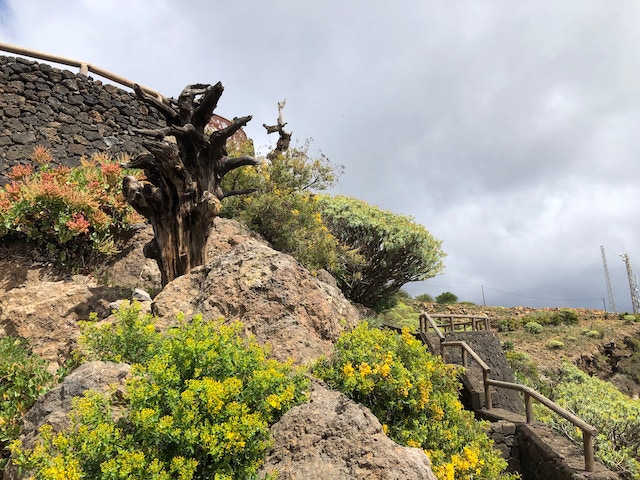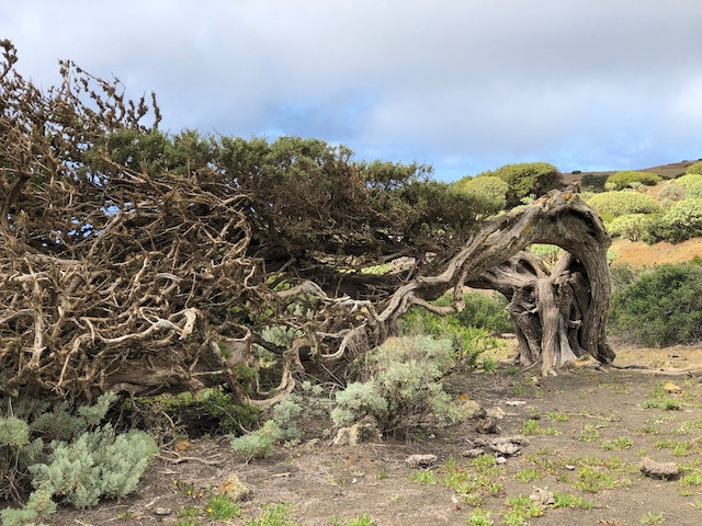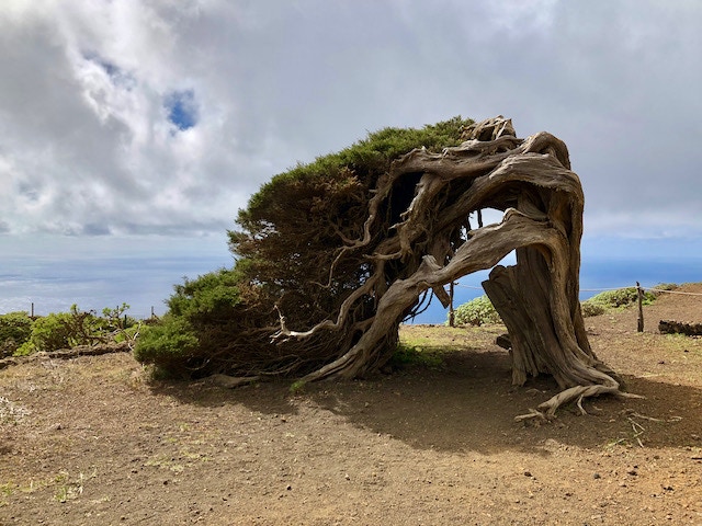 Auf den Weg zum westlichen Teil der El Hierros fahren wir durch grüne duftende Pinienwälder und machen Halt am Mirador de Bascos. Der Wind pfeift uns ordentlich um die Ohren. Die Aussicht ist fantastisch und die Paragleiter, welche über dem Tal schweben, kommen auf ihre Kosten. Gleich nebenan befindet sich das Gebiet von El Sabinar mit seinen Windflüchtern. Es ist schon erstaunlich wie die Wachholderbäume sich dem ständigen Wind angepasst haben und fantasievolle Objekte bilden.