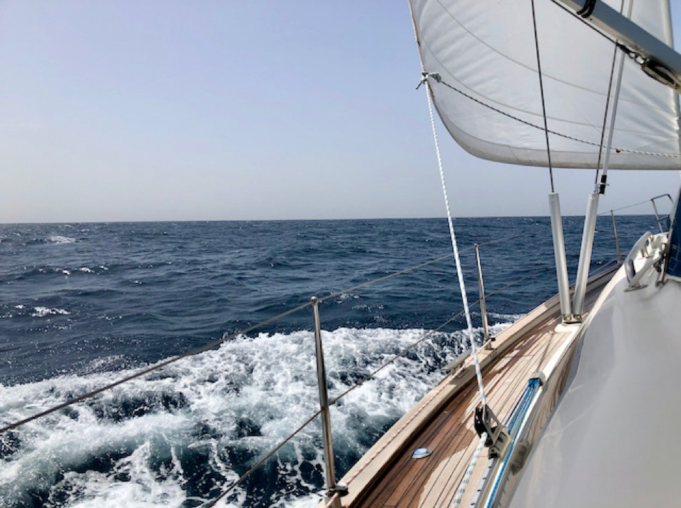 Zur Belohnung gibt es einen traumhaften Segeltag. Mit durchschnittlich 7 Knoten Fahrt, halben Wind, Sonne und der Begleitung von Delfinen düsen wir der kleinen Insel entgegen.