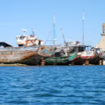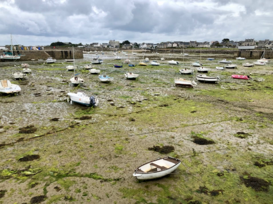 Der alte Hafen im Ort fällt bei Ebbe trocken und bietet uns ein interessantes Bild der dort festsitzenden Boote.