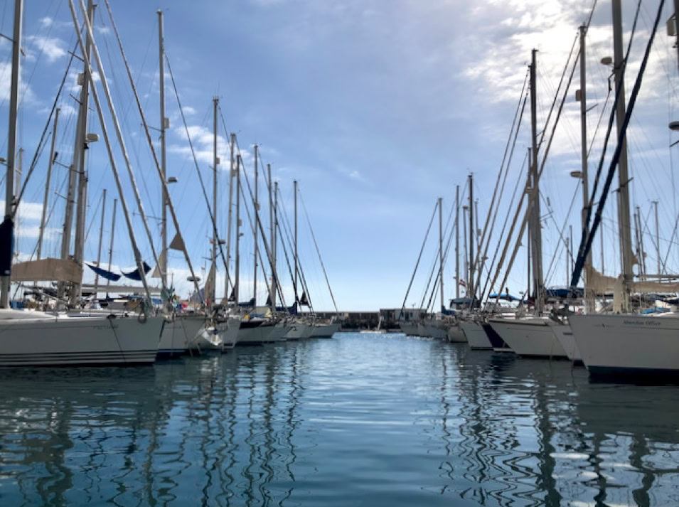 Die Anmeldung über Funk ist schnell erledigt und wir machen am zugewiesenen Stellplatz fest. Wir sind begeistert. Unser Platz ist ganz außen am Steg und wir können vom Cockpit auf die Hafenausfahrt samt Bucht schauen. Der Turm der Hafenanlage ist bereits mit Lichterketten für die Weihnachtszeit dekoriert und leuchtet uns am Abend entgegen.