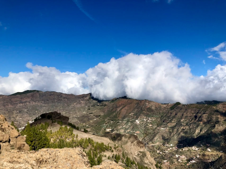 Unbedingt empfehlenswert ist die Inselmitte. Auf schmalen Serpentinenstraßen geht es hinauf in die Berge. Immer wieder unterbrechen wir unsere Fahrt, um die atemberaubende Ausblicke genießen. Den Rest laufen wir durch den duftenden Pinienwald bis zum Roque de Nublo mit seinen großen Steinmonolithen. Die Aussicht ist grandios und wir blicken hinüber zum wolkenumhangenen Teide auf Teneriffa. Dieses Erlebnis lässt uns zum Wiederholungstäter werden und wir schauen vom benachbarten Berg den Pico de las Nieves auf Täler und die umliegenden Berge.