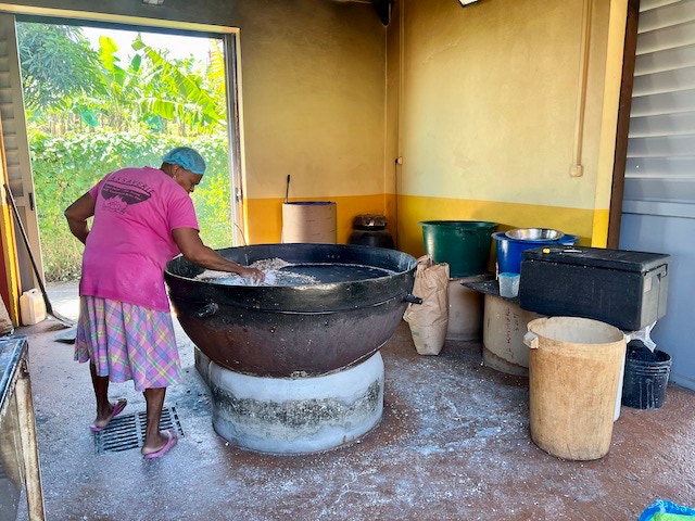 Wir beginnen unsere Rundfahrt mit einem Stopp an einer kleinen Kassaverie, wo aus Maniokmehl, einer Kartoffelart, traditionelle Fladen gebacken werden. Natürlich lassen wir es uns nicht nehmen, eine Kostprobe zu kaufen und als kleinen Imbiss zu verzehren. Das Gebäck ist zwar etwas trocken, schmeckt aber ganz gut.