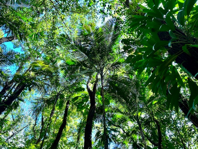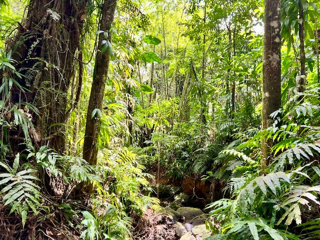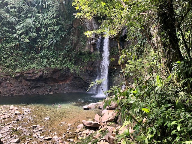Das eigentliche Ziel, einen 110 Meter hohen Wasserfall erreichen wir an diesem Tag nicht. Unser Navi führt uns zu einem Parkplatz von dem es zwar zu den Drei Wasserfällen geht, aber eben andere Wege ausweist als geplant. So wandern wir ca. 1 1/2 Stunden durch die wundervolle Natur des Regenwaldes zum „Troisieme Chute du Carbet“ , dem Dritten Wasserfall und müssen am Schluss sogar noch klettern. Doch der Aufwand hat sich gelohnt. Die Sonne lässt das Wasser leuchten und ein wunderschöner Ort belohnt uns für den doch etwas längeren Weg.