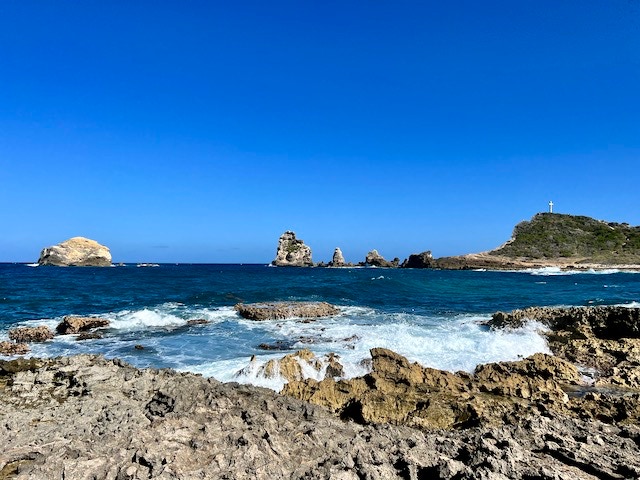 Leider sind die meisten schönen Strände Guadeloupes in diesem Jahr mit riesigen Teppichen an Braunalgen überschwemmt, also fallen unsere Strandspaziergänge nur kurz aus. Dafür lassen wir uns am nördlichsten Punkt, dem Pointe de la Grande Vigi, den Wind um die Nase wehen, essen Fisch in einem lokalen Restaurant, fahren an riesigen Zuckerrohrplantagen vorbei bis zum östlichsten Punkt dem Pointe des Châteaux auf Guadeloupe, wo der Atlantik und das karibische Meer aufeinander treffen. Einfach schön.