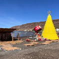 Hier heißt es erst einmal die Polizeistation zu finden und sich ordentlich anzumelden. Der Ort ist überschaubar und ganz hübsch. Uns gefällt der Weihnachtsbaum aus gelben Kanistern, der uns am Ufer entgegen leuchtet. Gleich daneben schüttet eine große Thunfischdose Geschenke aus.