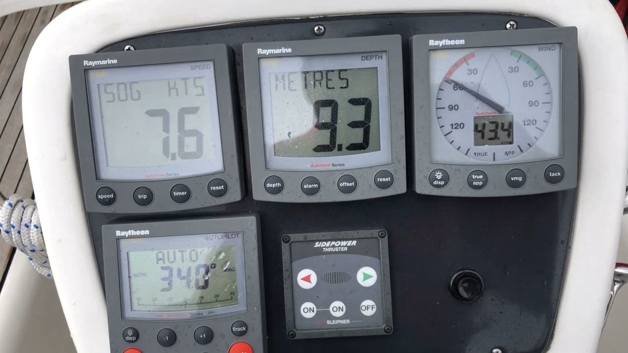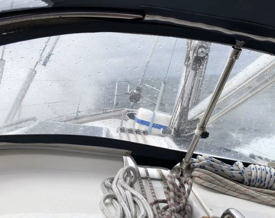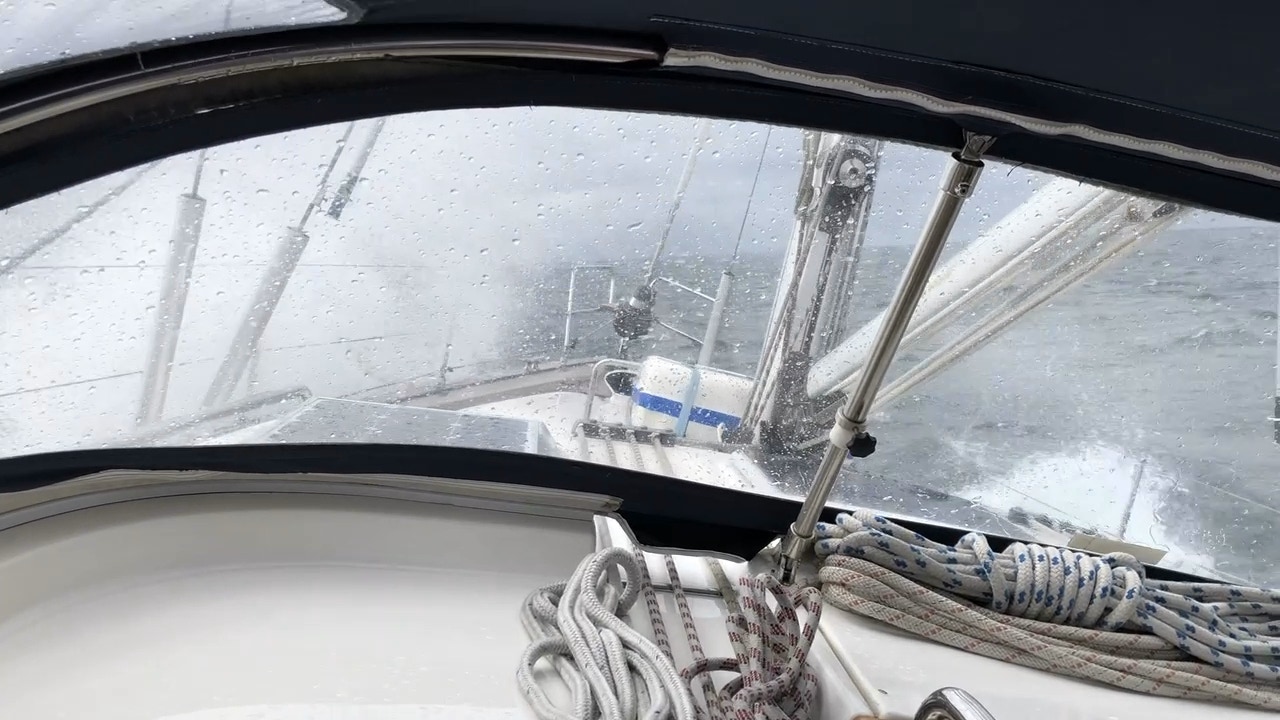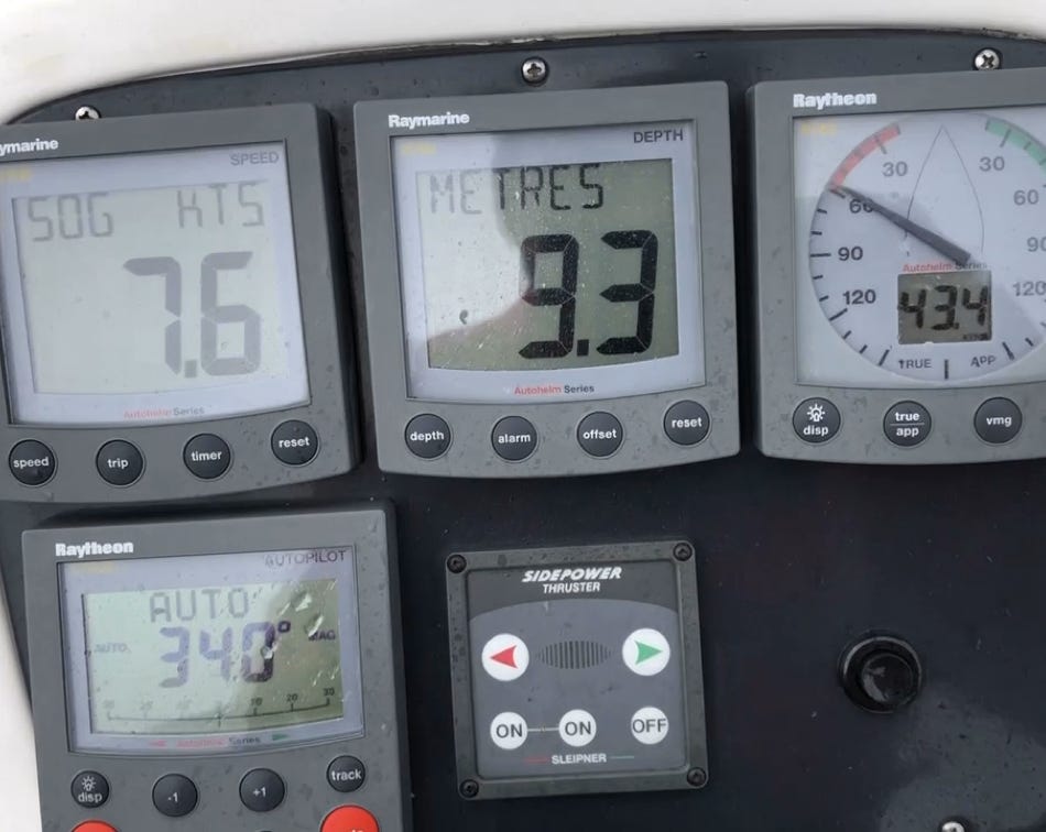 Auf der Ostsee mit dem üblichen „Ostseehack“ hat sich das Schiff als sehr Kursstabil erwiesen. Die Selbststeueranlage Raymarine ST 6001 steuert das Schiff zuverlässig auch durch ruppige See. Bei überkommender See ist der Wasserablauf über das Heck tadellos. In unserem Mittelcockpit sind wir noch nicht überspült worden. Bei langer Fahrt auf einer Bugseite läuft im mittleren Rumpfbereich das Wasser nicht ab und sammelt sich an der Fußreling.