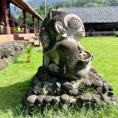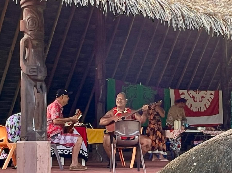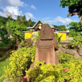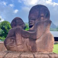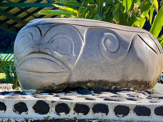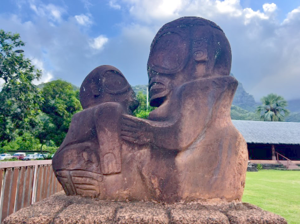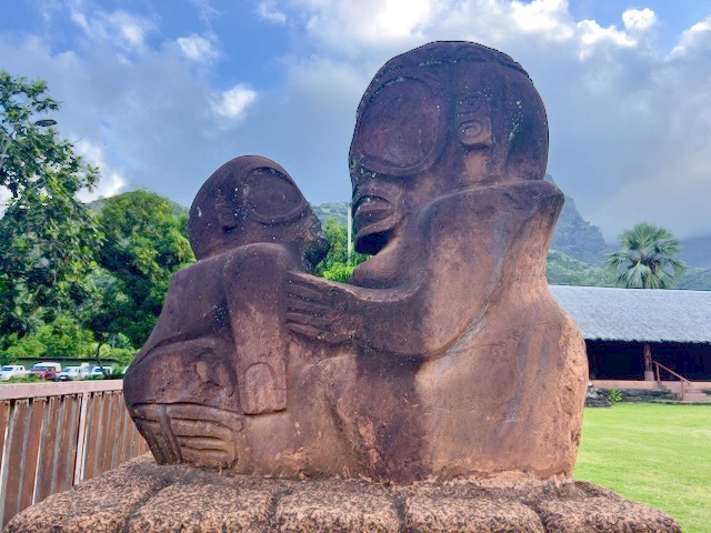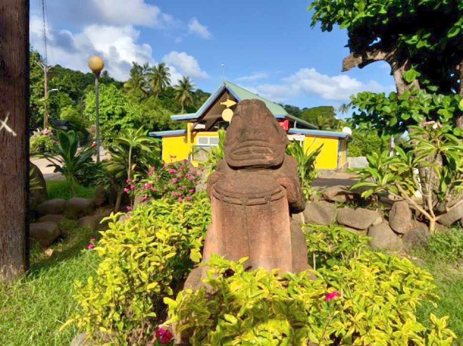 Atuoa ist sozusagen die Hauptstadt von Hiva Oa und sieht aus wie ein großes schönes Dorf. Hübsche Häuser stehen umsäumt von Gärten am Straßenrand. Überall leuchten Blüten und Pampelmusenbäume stehen in den Gärten. Ein großer Festplatz befindet sich im Zentrum des Ortes. Und überall finden wir die sogenannten Tikis. Figuren mit großen Köpfen und mythologischen Hintergrund. Was diese hier alle bedeuten, wissen wir nicht. Doch sie werden verehrt und auch als schöne Holzschnitzereien angeboten.