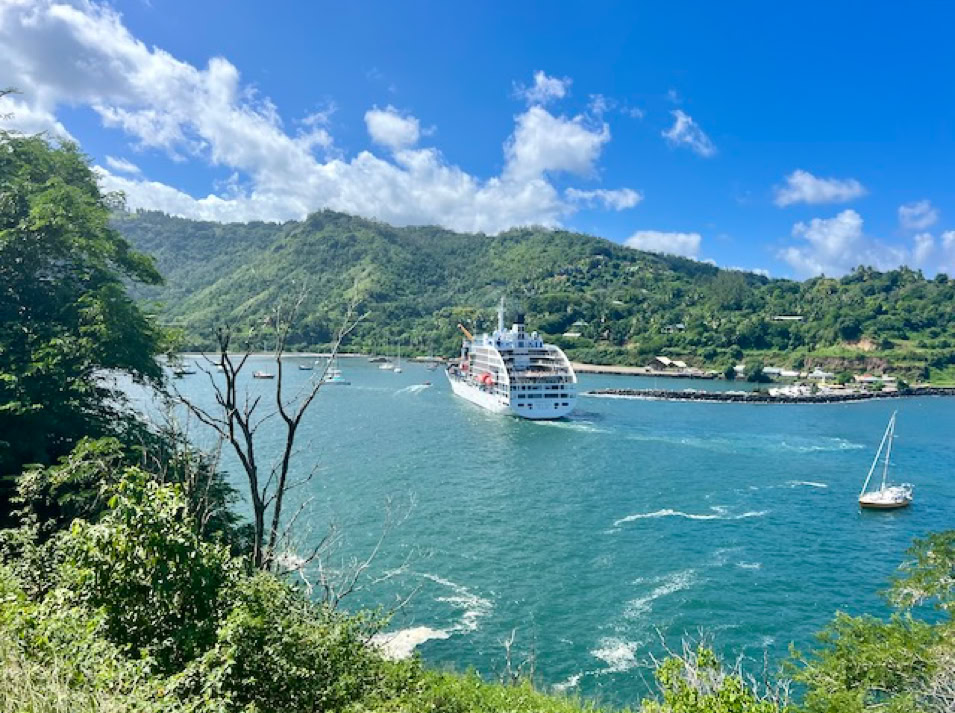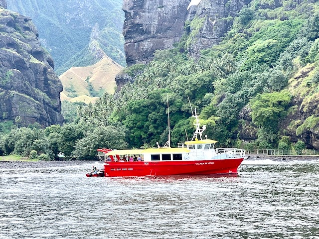 Immer am Donnerstag kommt das Versorgungsschiff in die Bucht. Während unseres Aufenthaltes läuft die „Aranui V“ den Hafen an, welche je zur Hälfte Kreuzfahrt- und Versorgungsschiff für die Inseln ist. Super Kombination. Das Treiben an diesem Tag ist beeindruckend. Gefühlt die ganze Insel findet sich im Hafengebiet ein. Es wird Be- und Entladen. Gabelstapler transportieren Container quer über den Platz. Es herrscht ein munteres Treiben in der ansonsten so ruhigen Gegend.