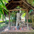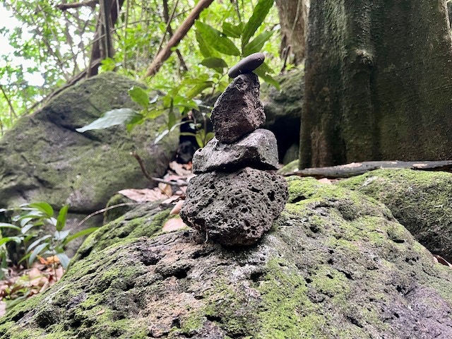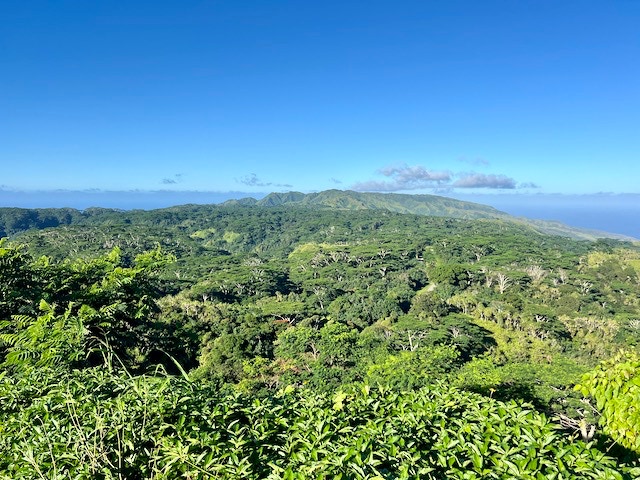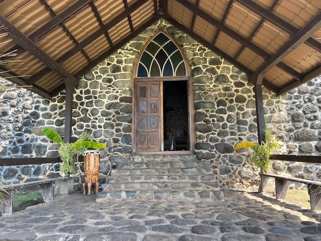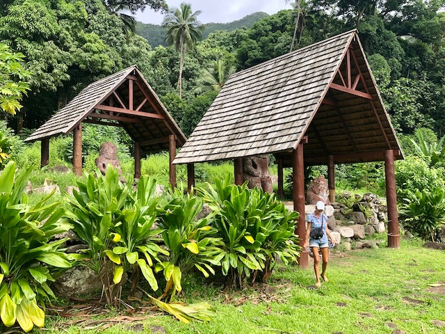 Mit einem Mietauto erkunden wir Hiva Oa. Verfahren kann man sich nicht. Es gibt nur eine Straße quer über die Insel. Dafür geht es aber steil bergauf und bergab. Unterwegs stehen mal Pferde, Kühe oder auch Ziegen am Straßenrand. Wir halten immer wieder an und genießen die wunderschöne Aussicht. Es geht zum lächelnden Tiki, welcher versteckt mitten im Wald steht und uns sehr gut gefällt, aber auch zum großen alten Tiki im kleinen Freilichtmuseum am Ende der Straße.