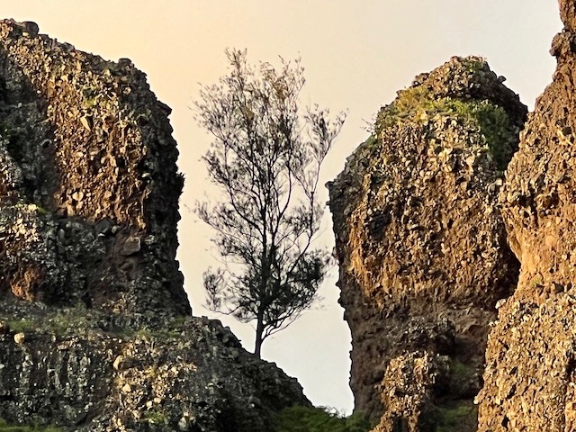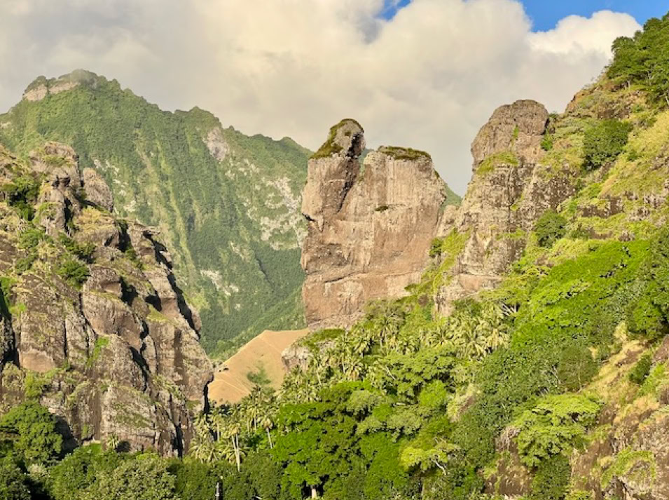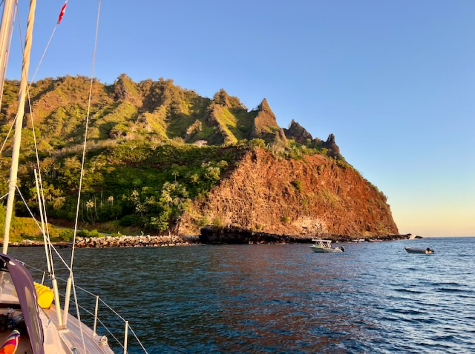 Die Ankunft in Fatu Hiva ist ein Traum. Beeindruckende Berge ragen hoch aus dem Ozean und die Felsformationen in der Ankerbucht regen unentwegt die Fantasie an. Sehen sie doch in jedem Tageslicht anders aus. Wir hören das Gemecker von Ziegen und entdecken diese zwischen den Felsen. Wahre Kletterkünstler!