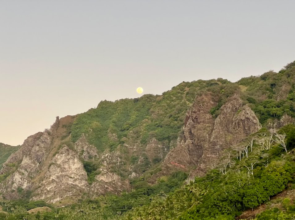 Am Abend werden wir entschädigt. Während im Westen die Sonne sanft in das Meer taucht, lässt sich ein fast voller Mond über dem Berg blicken. Ein gelungener Abschluss des Tages und ein schöner Start in den ruhigen Abend.