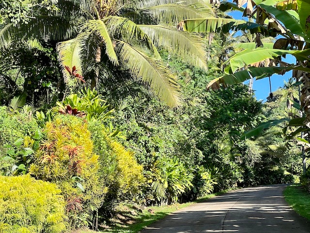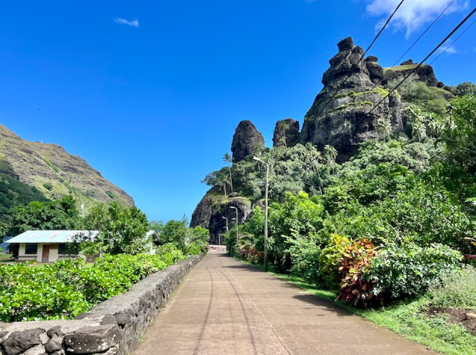 Wir wollen endlich alles erkunden und fahren mit dem Dingi an die kleine Pier, klettern an Land und müssen erst einmal die Muskeln unserer Seglerbeine aktivieren. Das Laufen fühlt sich ungewohnt und doch so großartig an. Es geht leicht bergauf immer die Straße entlang bis zu den den ca. 3 km entfernten Ort Atuoa. Nach unserem Aufenthalt in Panama fällt uns sofort auf, dass hier kein Müll herumliegt und alles sehr gepflegt ist. Das passt natürlich zu dieser wunderschönen Natur.