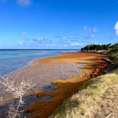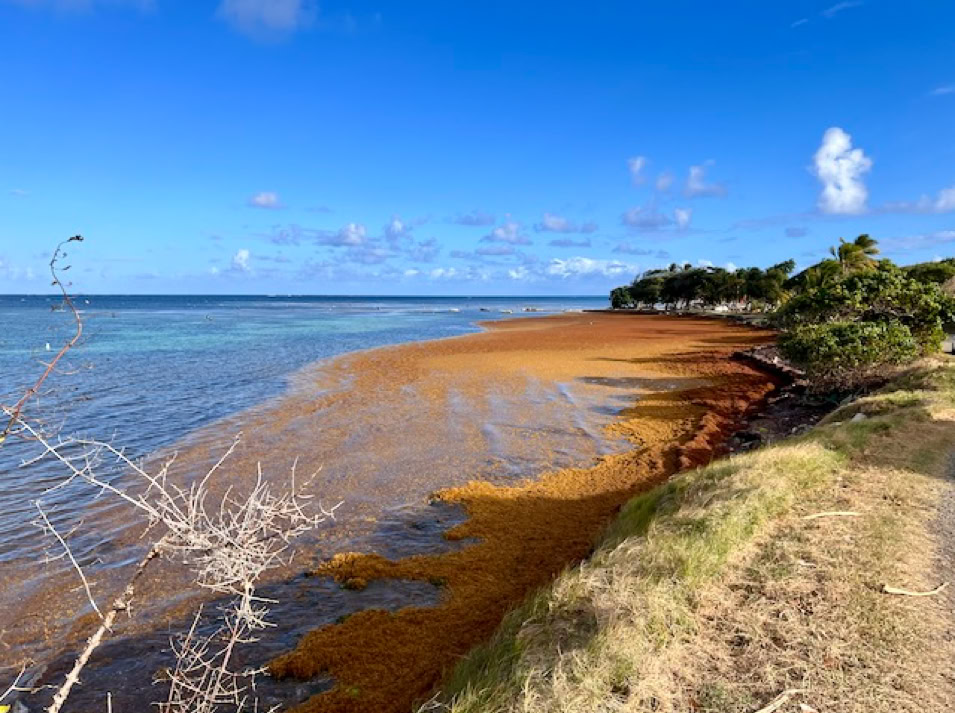 Am höchsten Berg und Vulkan Montagne Pelée waren wir nicht. Unser Leihauto ist ziemlich alt und hätte die Anstiege nicht geschafft. Aber gut. Wir beschließen, die Ostküste abzufahren, um uns auch von dieser Seite einen Eindruck zu verschaffen. Die Landschaft wird geprägt von riesigen Bananenplantagen und Zuckerrohrfeldern. Braunalgen sammeln sich an den Stränden der Ostküste und unterbrechen das Blau des Meeres.