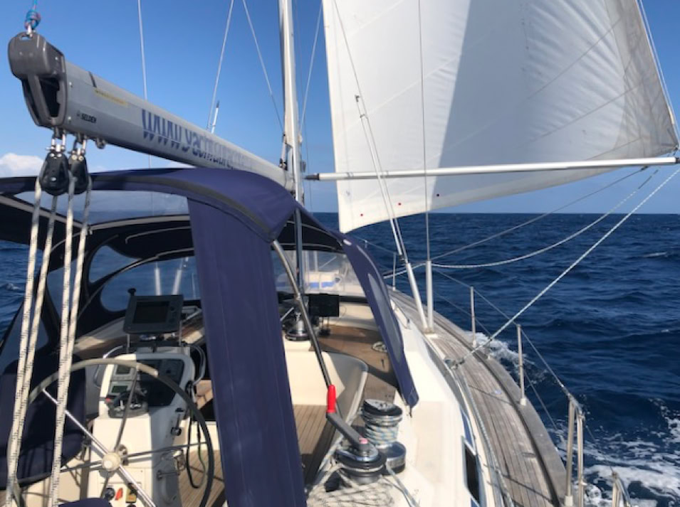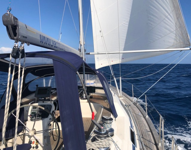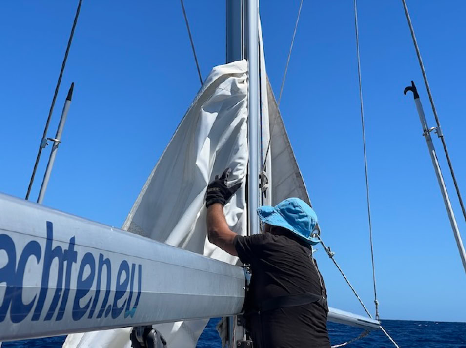 Auf den letzten Meilen funktioniert die Rollanlage unseres Großsegels nicht mehr. Eine Latte ist gebrochen und unser Segel klemmt fest. Nach vielen Versuchen es doch noch zu befreien, fixieren wir es schließlich am Baum und an der Reling und segeln nur mit Genua weiter. Ärgerlich! Doch es funktioniert und wir kommen weiter gut voran.