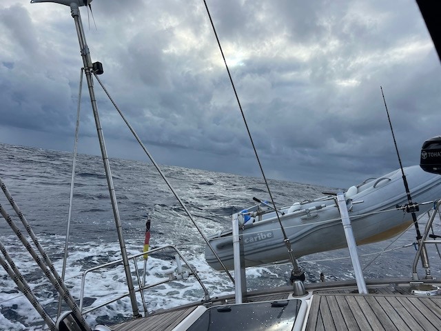 Auf unserer Atlantiküberfahrt kam die Welle meist von achtern, sodass wir gut im Vorschiff schlafen konnten. Nun ist alles irgendwie kreuz und quer und dieser Platz äußerst ungemütlich. In unserer Koje lässt der Lärm des Motors keinen Schlaf zu. Also richte ich unsere schmale Saloncouch als Schlafplatz ein. Nicht gerade viel Platz, doch hier ist es am ruhigsten und wir finden hier abwechselnd schnell in den Schlaf.