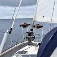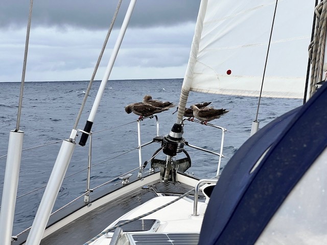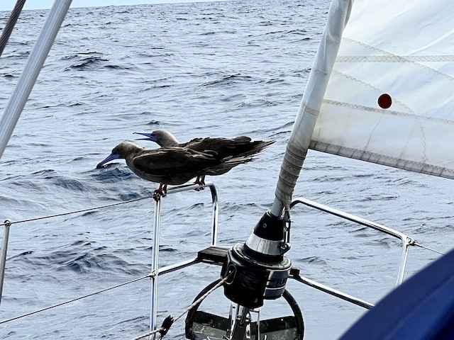 Tölpel umkreisen uns und suchen sich an der Bugreling einen Platz, um ein wenig mit zu fahren. Die Taxifahrt scheint sich schnell herum zu sprechen und so landen regelmäßig 4 bis 5 Tölpel auf der Manatee. Bezahlt wird die Fahrt dann mit jeder Menge Sch …, welche dann wie ein Gemälde unsere Genua zierte. Vielen Dank ;-)