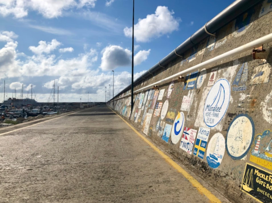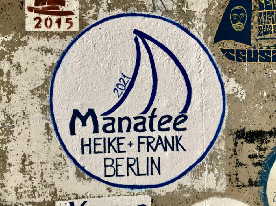Ein wichtiger Punkt auf unserer To-Do-Liste steht auf dem Plan. Mit Farben und Pinsel gewappnet geht es an die Pier. Liebevoll malen wir unser Logo an die Wand. Gar nicht so einfach bei den Unebenheiten. Aber das Ergebnis kann sich sehen lassen und wir sind stolz auf unser Werk.