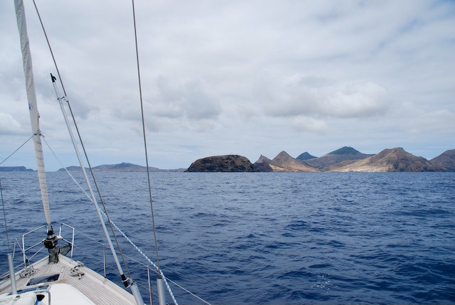Land in Sicht! Vor uns liegen die Berge von Porto Santo und anstatt der Wind uns weiter zur Insel schiebt, schläft er einfach ein. So muss der Motor wieder ran.