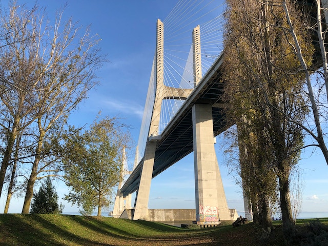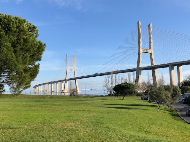 Das Mietauto ist abgegeben und wir schnappen uns unsere Räder, fahren entlang des Tejo bis zur Flussmündung des Trancão, einem Nebenfluss, um noch ein Stück an dessen Ufer entlang zu radeln. Auf dem Rückweg halten wir unter der Ponte Vasco da Gama und entdecken die Brücke mal in einer neuen Perspektive. Das Gebiet unter der Brücke wird von einem großen Skaterpark und vielen Grünanlagen geprägt. Es ist schön hier.